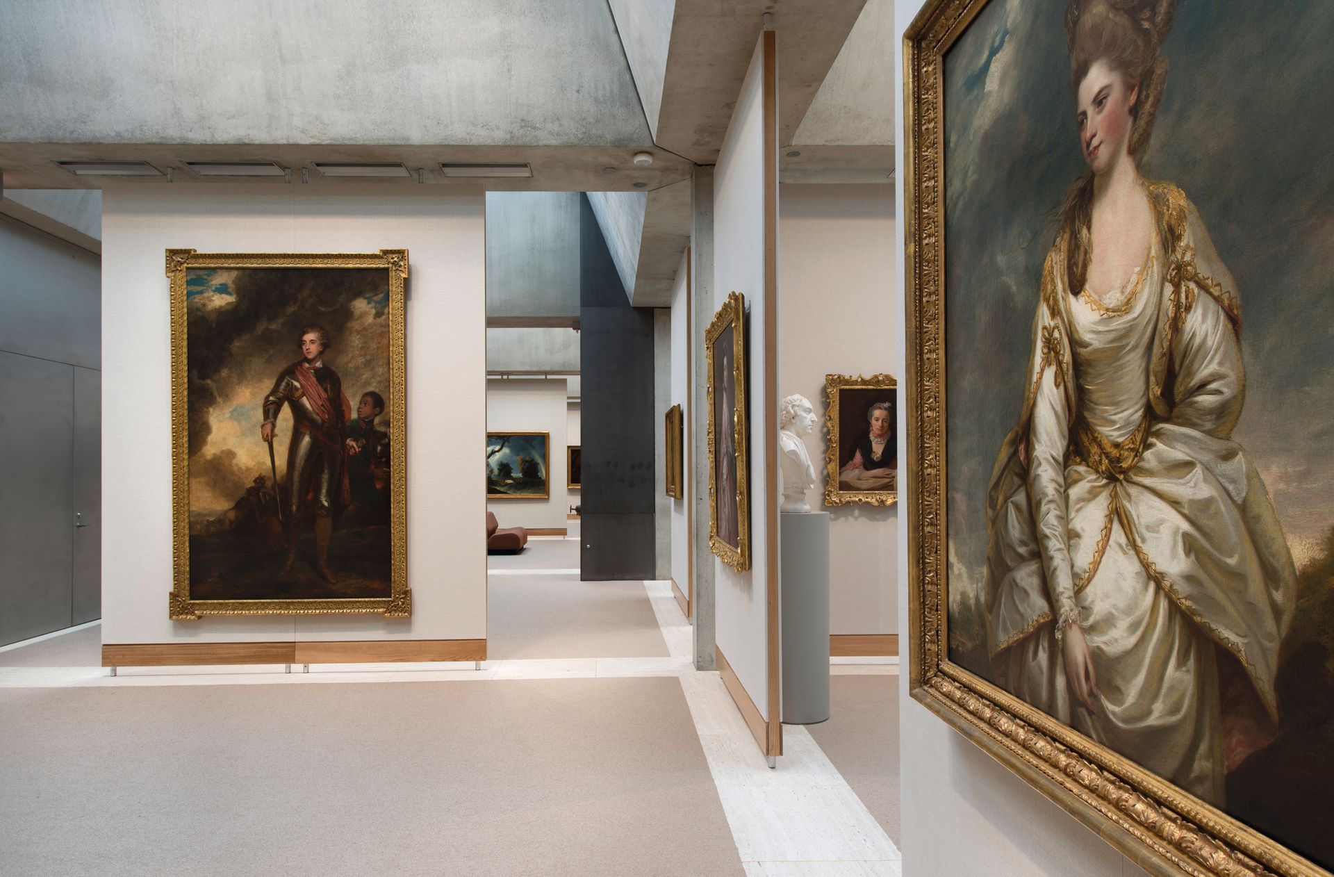 The pogos were removed in the Long Gallery, which has been restored to its original seven-bay open sweep and its function as a study centre. The works in each bay are hung salon-style, with a different theme—parents and children, gardens, horse-racing and hunting—and juxtaposed with recent acquisitions. The 21st-century portrait of the artist and poet Ian Hamilton Finlay by Eileen Hogan, for example, hangs next to 17th- and 18th-century works. Kahn flanked each end of the gallery with a glass-enclosed office, but these were not ranked as being of high cultural significance in the plan. One has been converted to a high-tech collections seminar room.