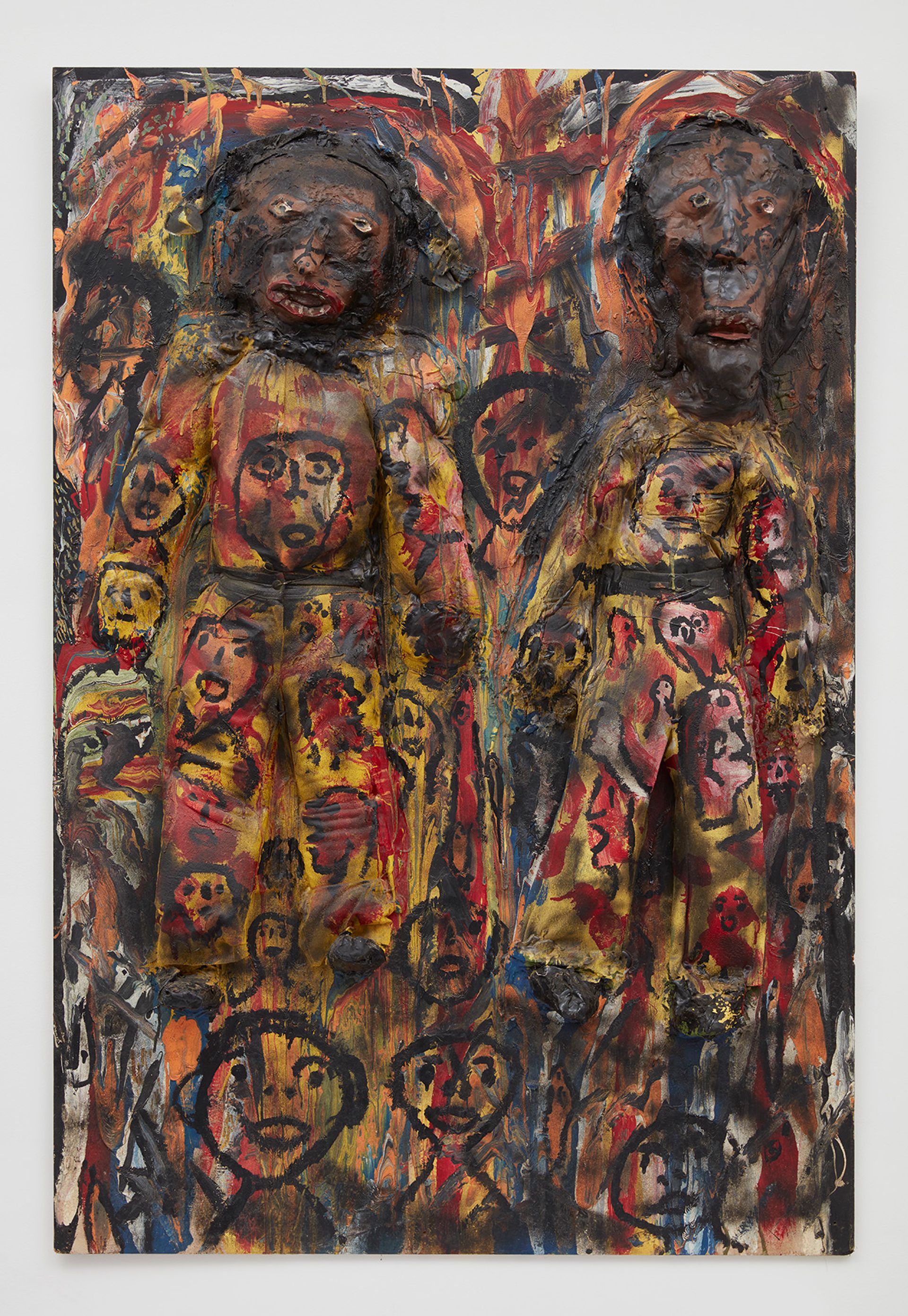 Another construction on wood, Suspects (1989), depicts two African American men who appear to be standing against a wall, surrounded by faces that stare back at the viewer from the canvas. “The titles of the works illustrate the themes that Dial conveyed throughout his career, and a piece from the 1980s can still be interpreted in a current context—either with the Black Lives Matter movement, or in a myriad of different ways,” Turner says. “The show presents an overall theme, but at the same time provides an overview of how these themes expanded throughout the years.”