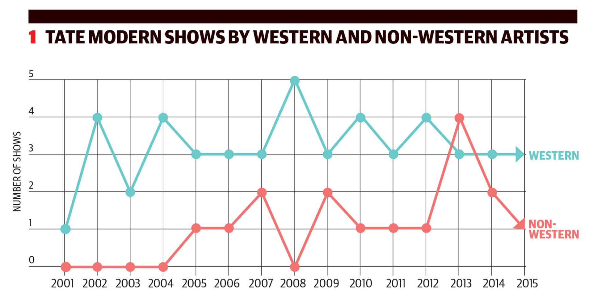 The Tate is keen to celebrate the fact that its programme for the newly expanded Tate Modern marks a major shift in its display strategies, including more geographical diversity, more female artists and a greater emphasis on the contemporary. We analysed major solo exhibitions at Tate Modern, from its first show in 2001 to 2015, to see how it was getting on so far, as well as looking at its visitor attendance compared with other national galleries and museums.