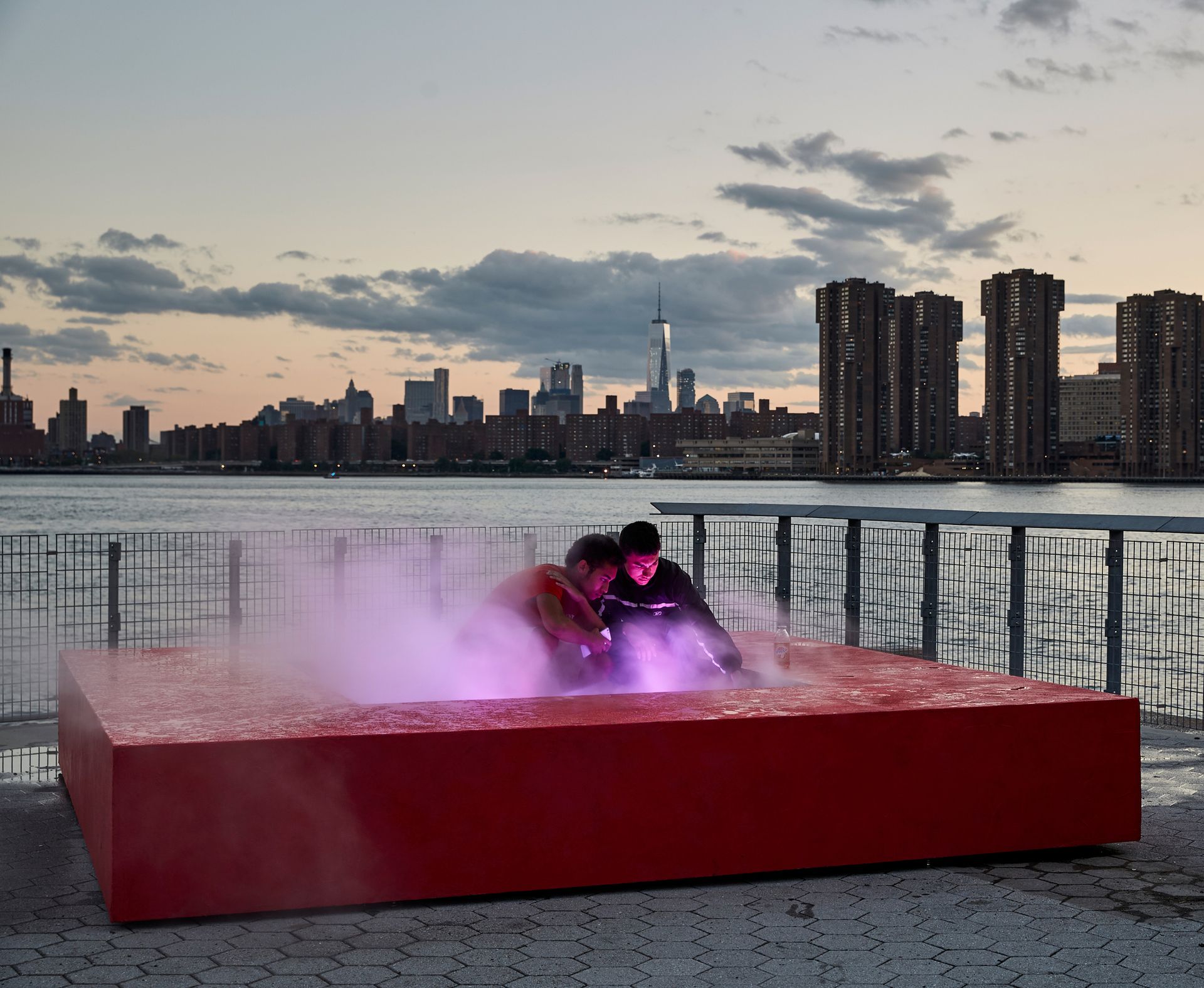 The students chose the Brooklyn-based artist Mika Tajima, whose sculpture is part public seating, part economic mood ring. Installed on the waterfront in Hunter’s Point South Park, Meridian (Gold) looks like a hot tub with plumes of coloured vapour rising out the top. The water’s hue changes from magenta to turquoise based on the fluctuating price of gold. Although the US economy is no longer directly tied to the value of the metal (the country abandoned the gold standard in the 1930s), Tajima was interested in the fact that its value still reflects our confidence in the economy.