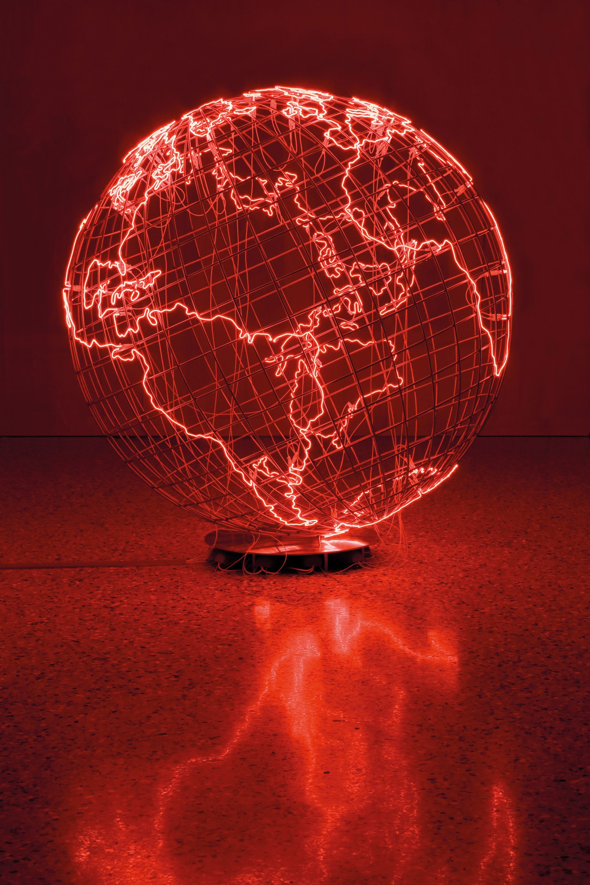 Hatoum was born in Beirut to a Palestinian family and has lived in England since war broke out in Lebanon in 1975. Her other works, both personal and political, often seem to employ more obvious and familiar tactics to make their point and create an impact. A common household grater becomes an unheimlich perforated barrier when blown up to a monumental scale and titled Grater Divide just to hammer the message home. There is also little left to the imagination in the seat of a chair that sprouts a triangle of (real) pubic hair in a laboured tribute to René Magritte. Similarly, the contours of countries across an entire globe are rendered in a fiery outline of red neon, just to remind us—in case we didn't already know—that today the whole world is a hot spot.