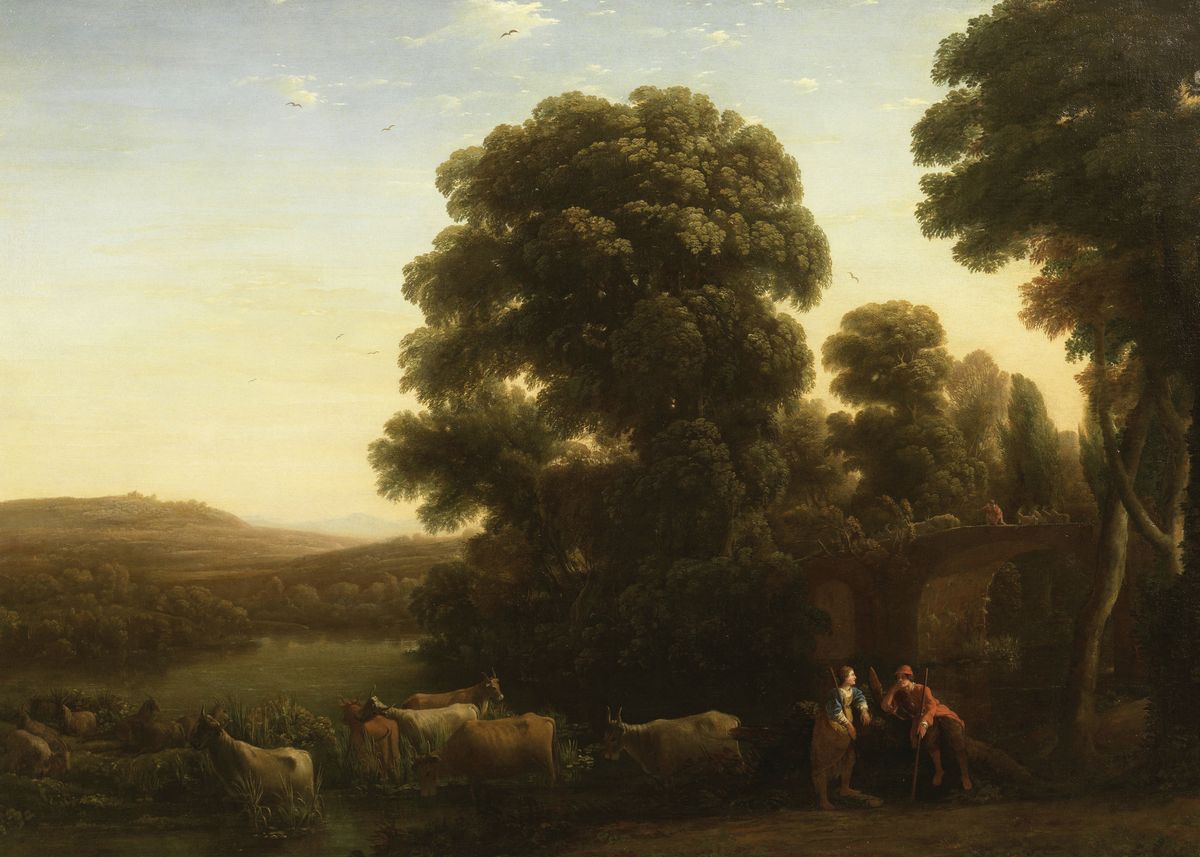 Claude Gellée, called Claude Lorrain, A pastoral landscape with a shepherd and shepherdess beside their livestock in an Arcadian landscape with drovers on a bridge beyond (1635-37) Bonhams, New Bond Street, Old Master Paintings, 6 July