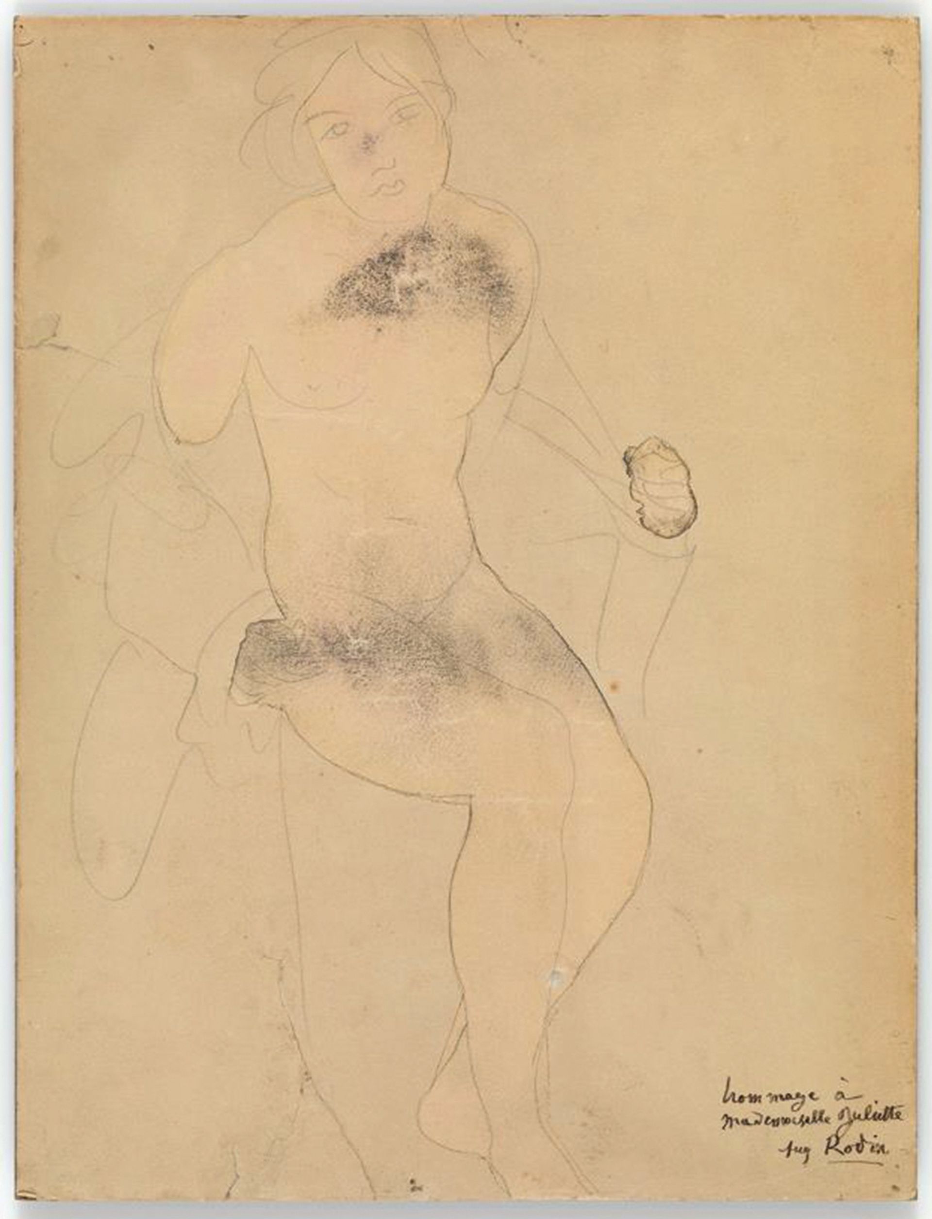 Rodin gave Cooke two of his works. One was a drawing of a young woman opening her dressing gown, inscribed Hommage à Mademoiselle Juliette. The Rodin specialist Christina Buley-Uribe (author of My Divine Sisters, a book on Rodin’s women) dates it to about 1900—in which case it cannot depict Cooke. However, it would have been more likely for Rodin to have given the actress one of the drawings he made of her (the facial features in the one presented to her are not clear enough to identify the sitter). The second gift was a plaster maquette of a relief of a female bust, not based on Cooke. Rodin also gave her his photograph.