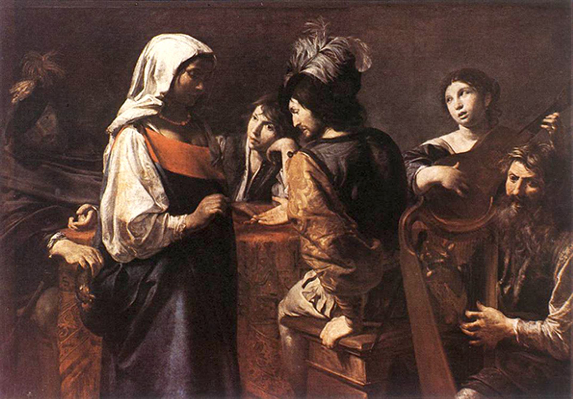 To launch right in: Valentin’s canvas, slightly under five feet high by slightly over five and a half feet wide, depicts in a naturalistic manner derived from post-1600 Caravaggio, which is to say in a style based at once on strong local color and powerful chiaroscuro, six figures (four men, two women) in a shadowy but otherwise unspecified interior space. The central figures are a standing young woman – by her red and blue dress and dark coloring, as well as by her actions, a gypsy – who is engaged in telling the fortune – reading the palm – of a seated young man in expensive clothes and a feathered hat. At the right, a young woman plays a guitar while a seated older man with an unruly gray beard and piercing eyes plays a smallish harp. The harpist appears to be singing and the young woman may be doing so as well.