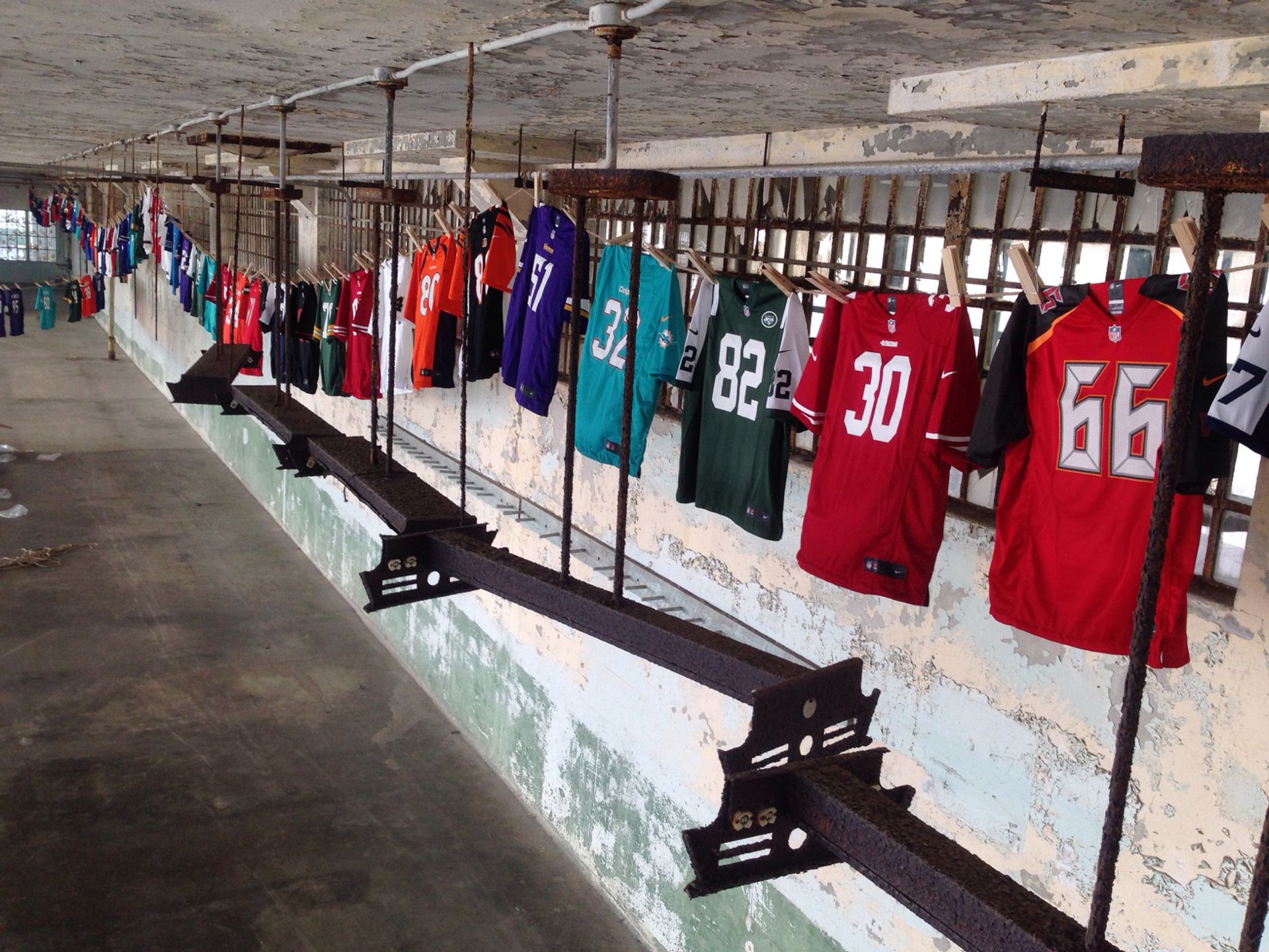 In another work, 100 football jerseys that Saiers purchased online have been pinned to hemp rope, and the large scale of the piece is meant to express the length of prison sentences. Some of the jerseys have site-specific historical references, such as the nod through a Chicago Bears jersey to the infamous Alcatraz inmate Al Capone.
