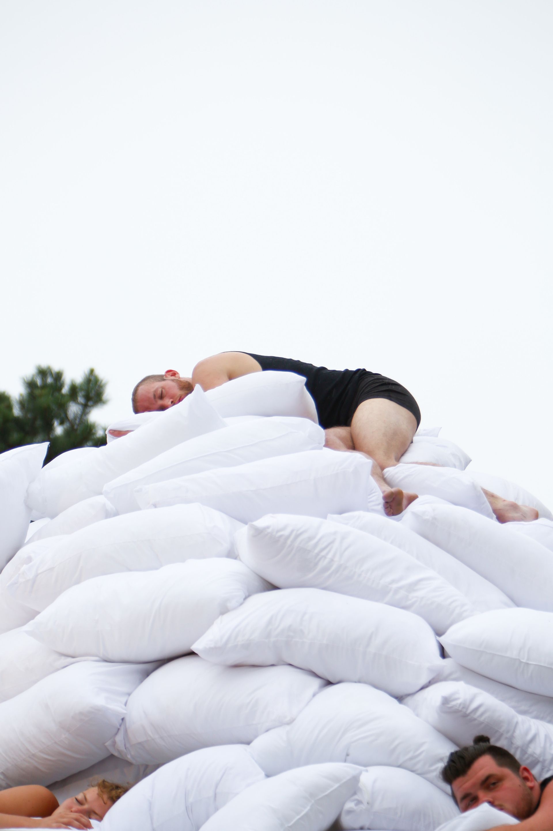 “Those don’t look like pillows,” one partygoer said suspiciously, from the safety of the tent, eyeing a pile of bodies sleeping on a pyramid of pillows on a roof across the way (Brian O’Mahoney’s cats sleep anywhere).