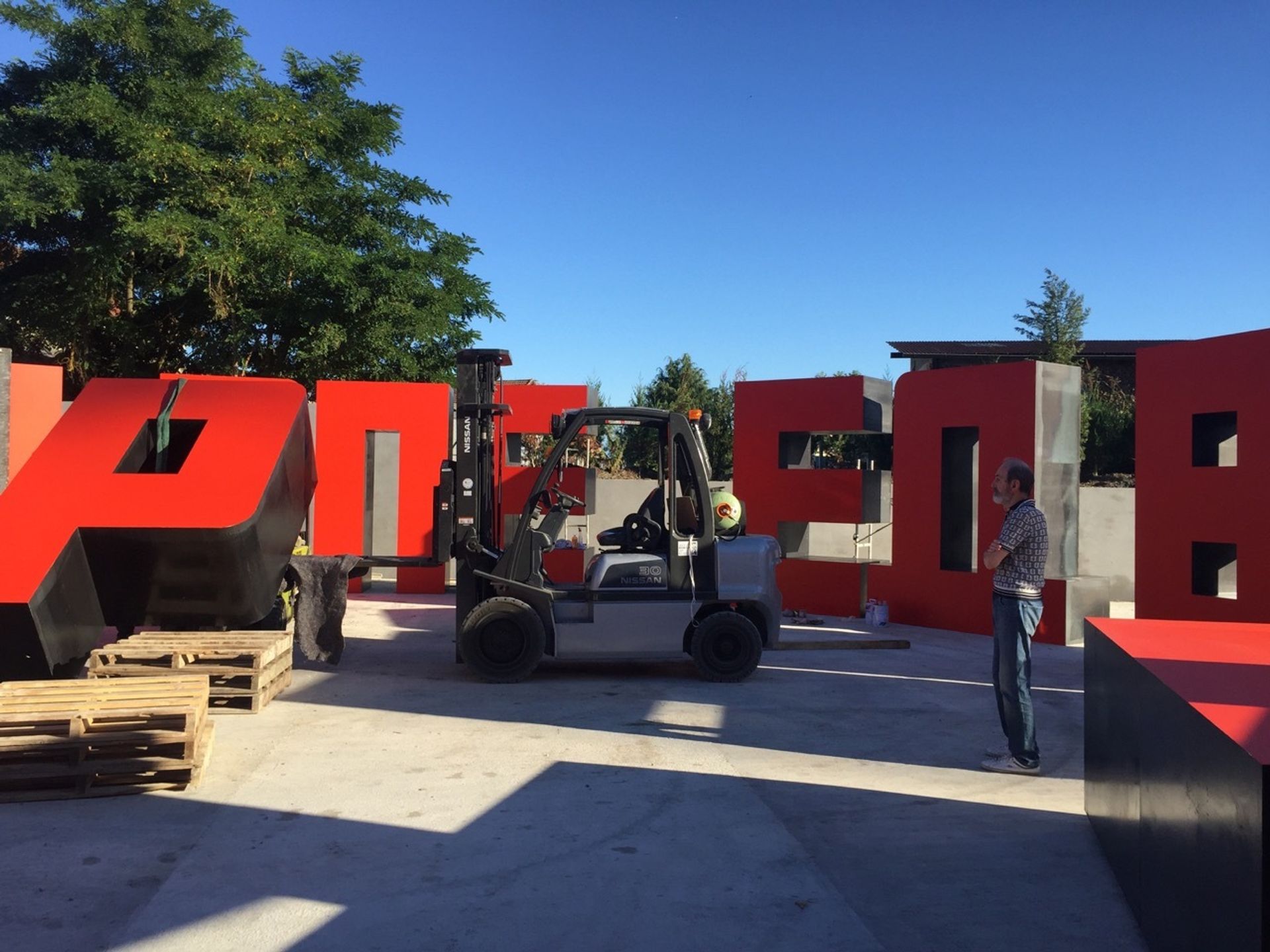 One of the works, a circular piece more than 18 metres wide, comprises a series of Cyrillic letters made from black steel that spell out and repeat the word “forward”.