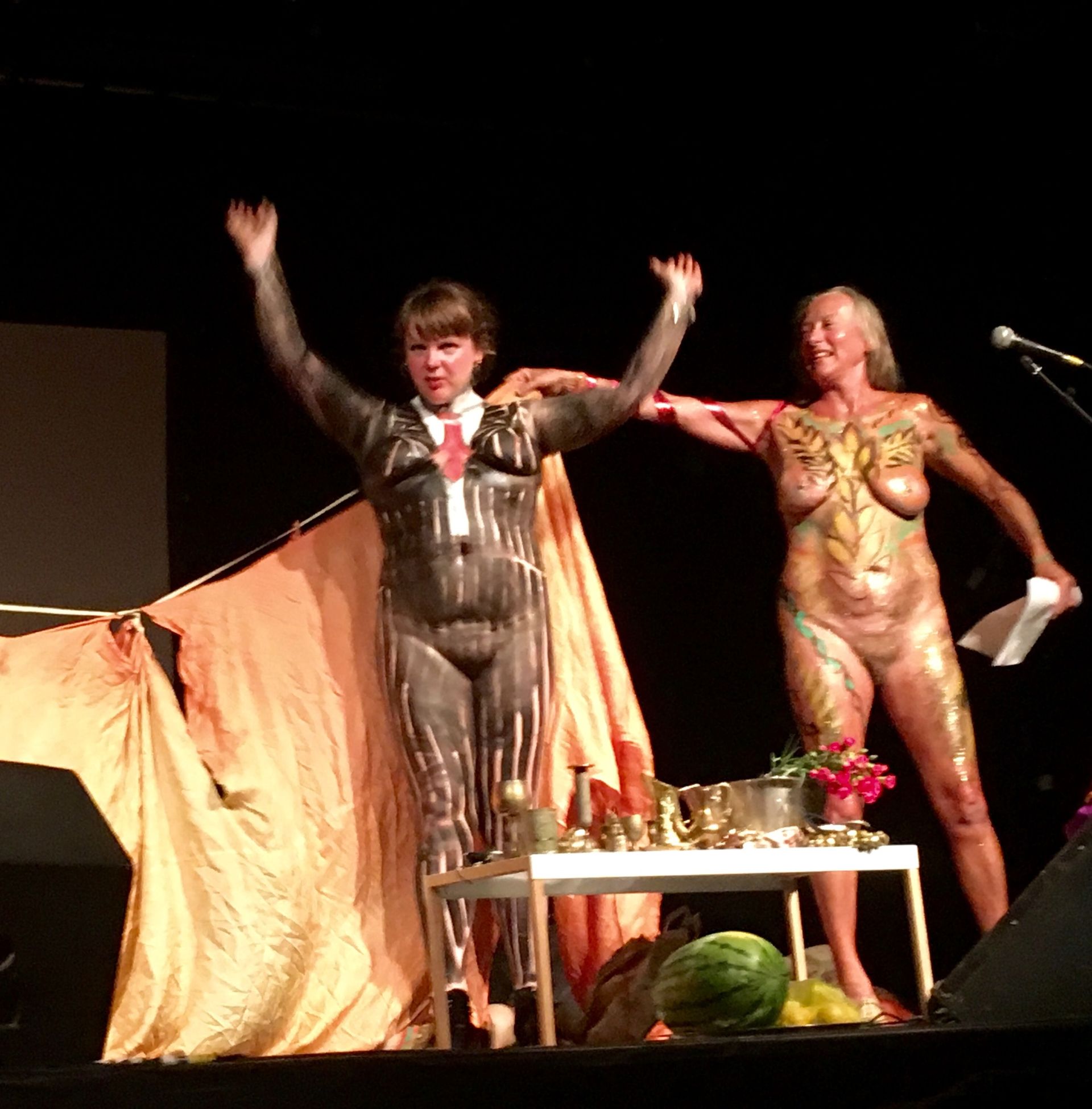 The co-founder Herbert Read’s aim for London’s Institute of Contemporary Arts to be an “adult play centre” was fulfilled with a vengeance last night (24 August). A Neo Naturist performance extravaganza captured every bit of the innocent anarchy of the group’s 1980s heyday. A multigenerational troupe of naked participants made their NN debut alongside veterans in a series of elaborate, ritualistic and often hilarious events involving bodies painted as pinstriped bankers and dungareed farmers; sheaves of corn; flagons of beer; proffered plums; and showers of cornflakes and glitter. All this was presided over by the original NN triumvirate of Christine and Jennifer Binnie and Wilma Johnson, who were resplendently painted as corn harvest goddesses.
