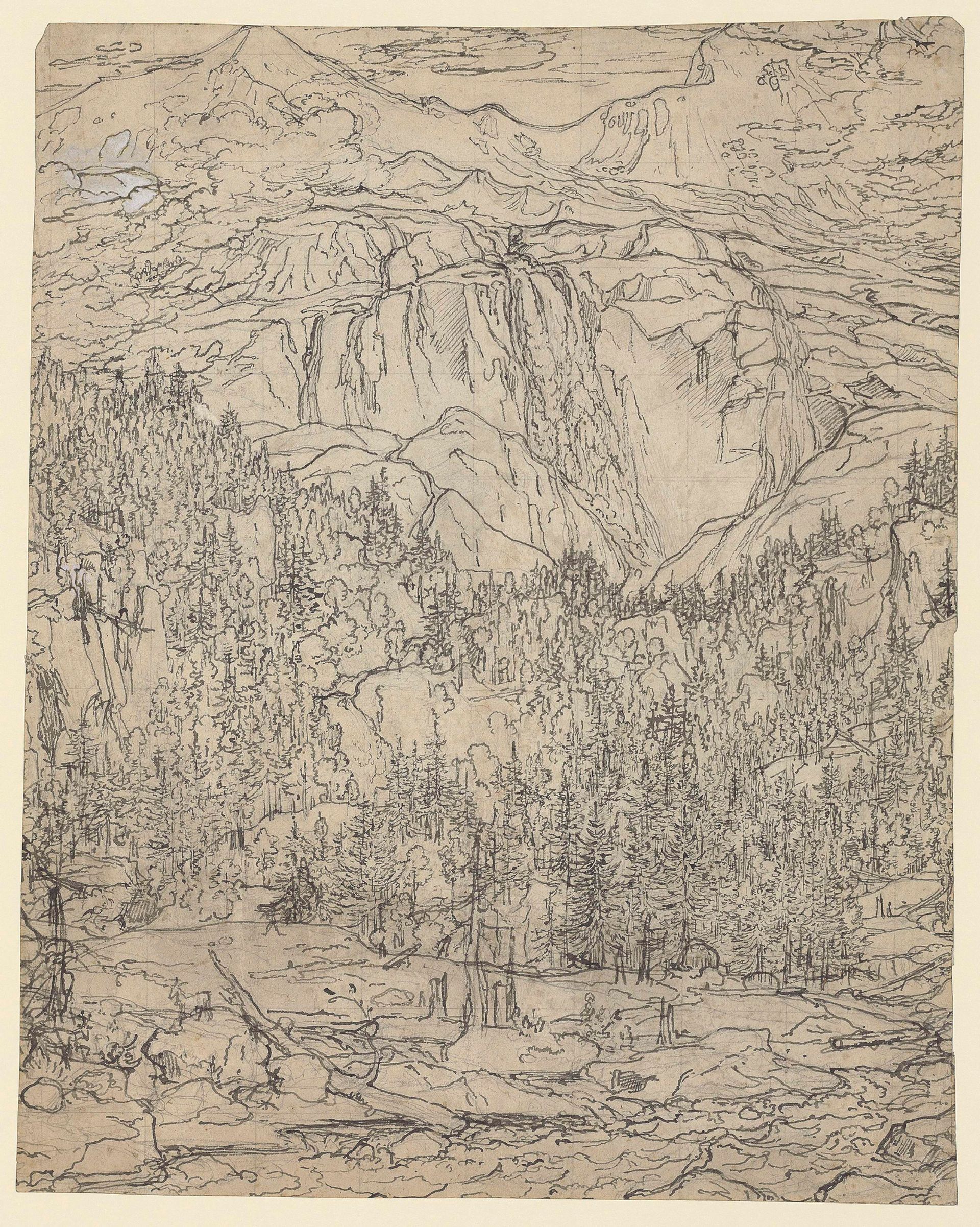The Schmadribach Waterfall near Lauterbrunnen, Switzerland (recto); a faint sketch of a mountainous landscape (verso)