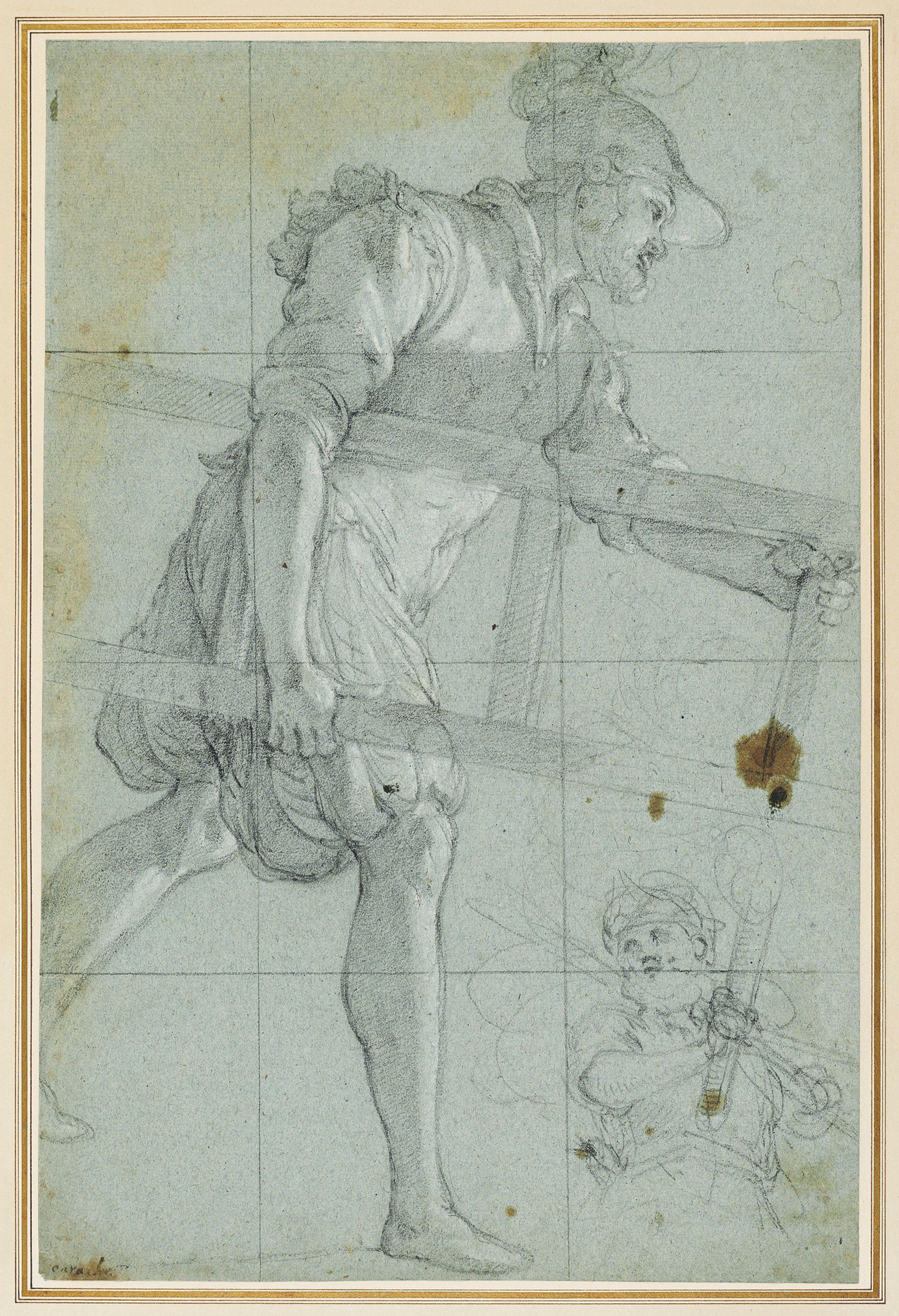 A soldier carrying a ladder, and a subsidiary study of a man holding a torch (recto); faint fragmentary study (verso)