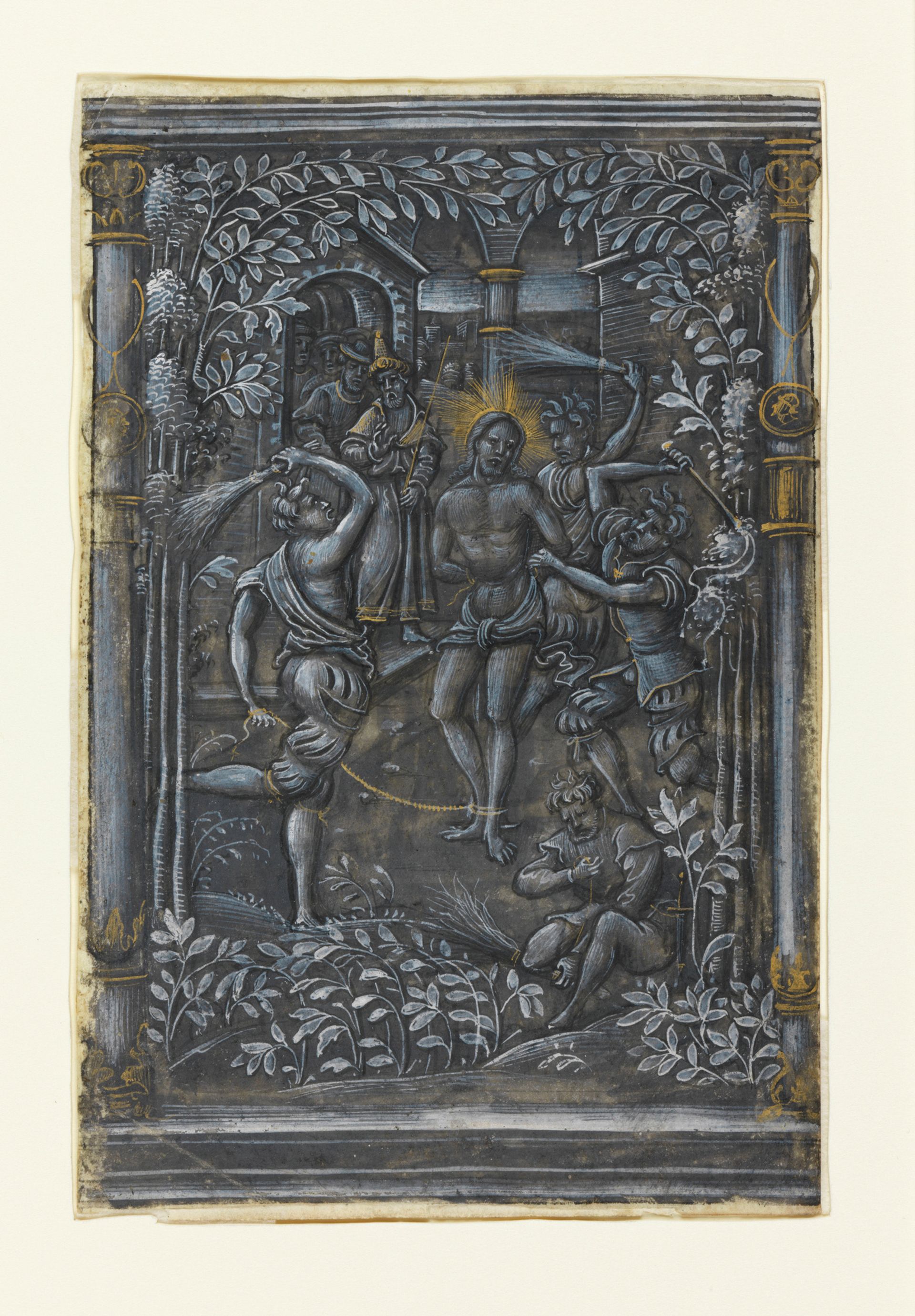Although the exhibition is focused on colour, there is one area dedicated to the minimal materials used in grisaille—painting in shades of grey. Pigment analysis shows that this work, one of a set of five miniatures, uses a rare “antimony black”, while the other four use the more widely available, carbon-based black. This, together with a finer style and technique, makes it likely that it was completed by the master and the others by his assistants.