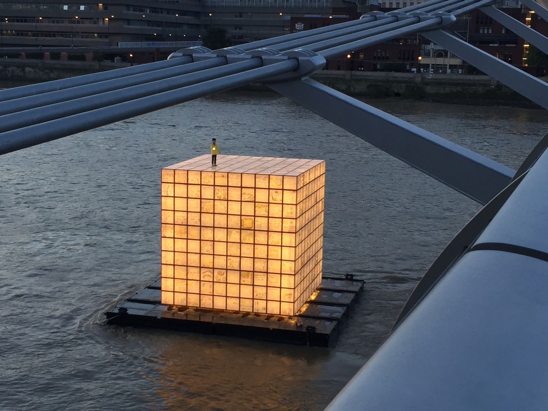 The seven-metre high installation—an illuminated, cubed structure floating on the Thames near the Millennium Bridge—is by the South Korean artist Ik-Joong Kang. A sculpture of a child holding a flashing light stands on top of the cube, which is entitled Floating Dreams.