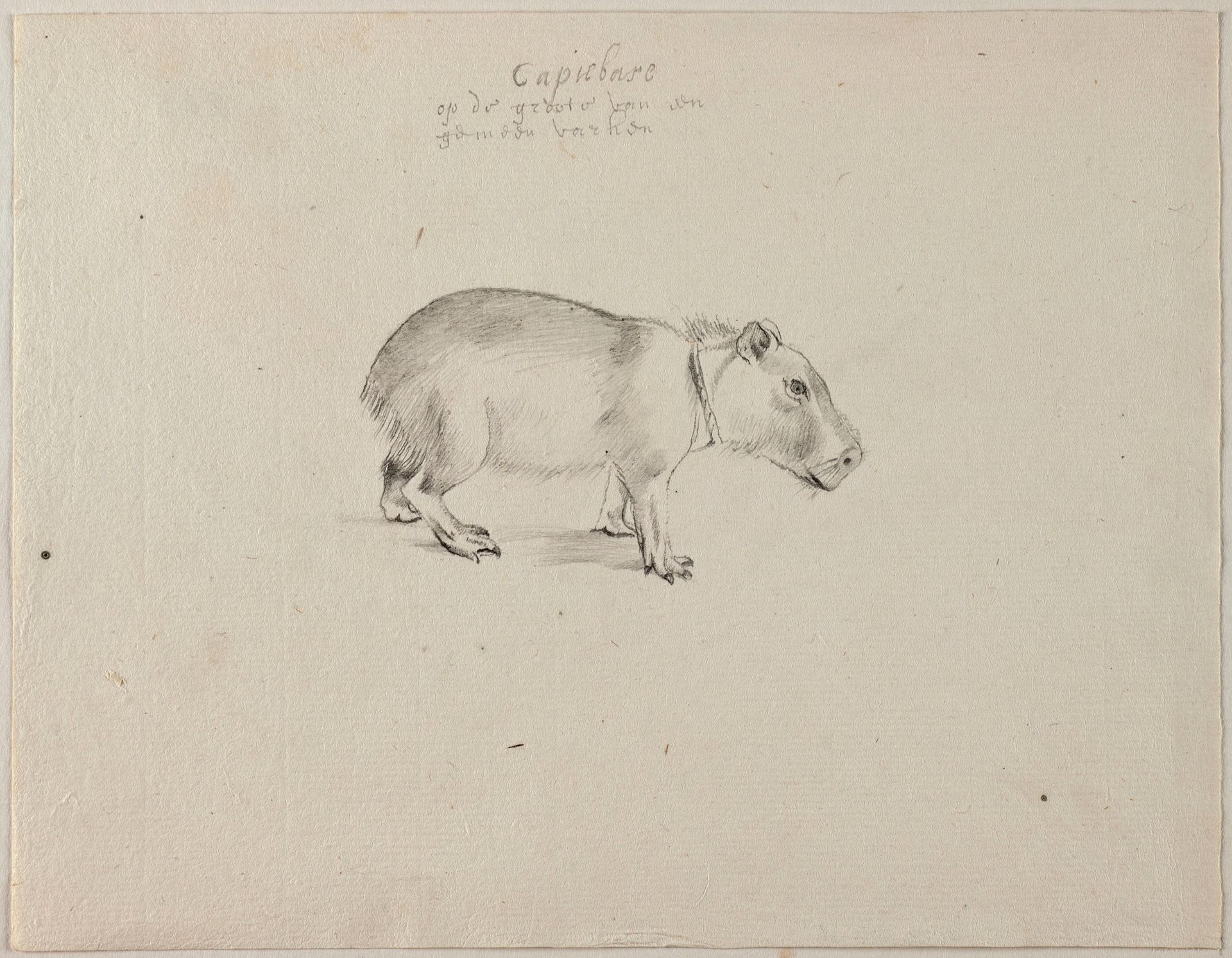 Among the key evidence are depictions of a capybara, a large Latin American rodent. A capybara appears in Post’s oil painting View of the River São Francisco, Brazil (1639), now in the Louvre, and it is exactly the same as the animal in a preparatory drawing in the Haarlem album, except for one feature. In the preparatory drawing, the animal has a rope collar on its neck, showing that it was depicted in captivity. This proves that the drawing was not done after the painting, but was made in preparation for the subsequent oil painting.