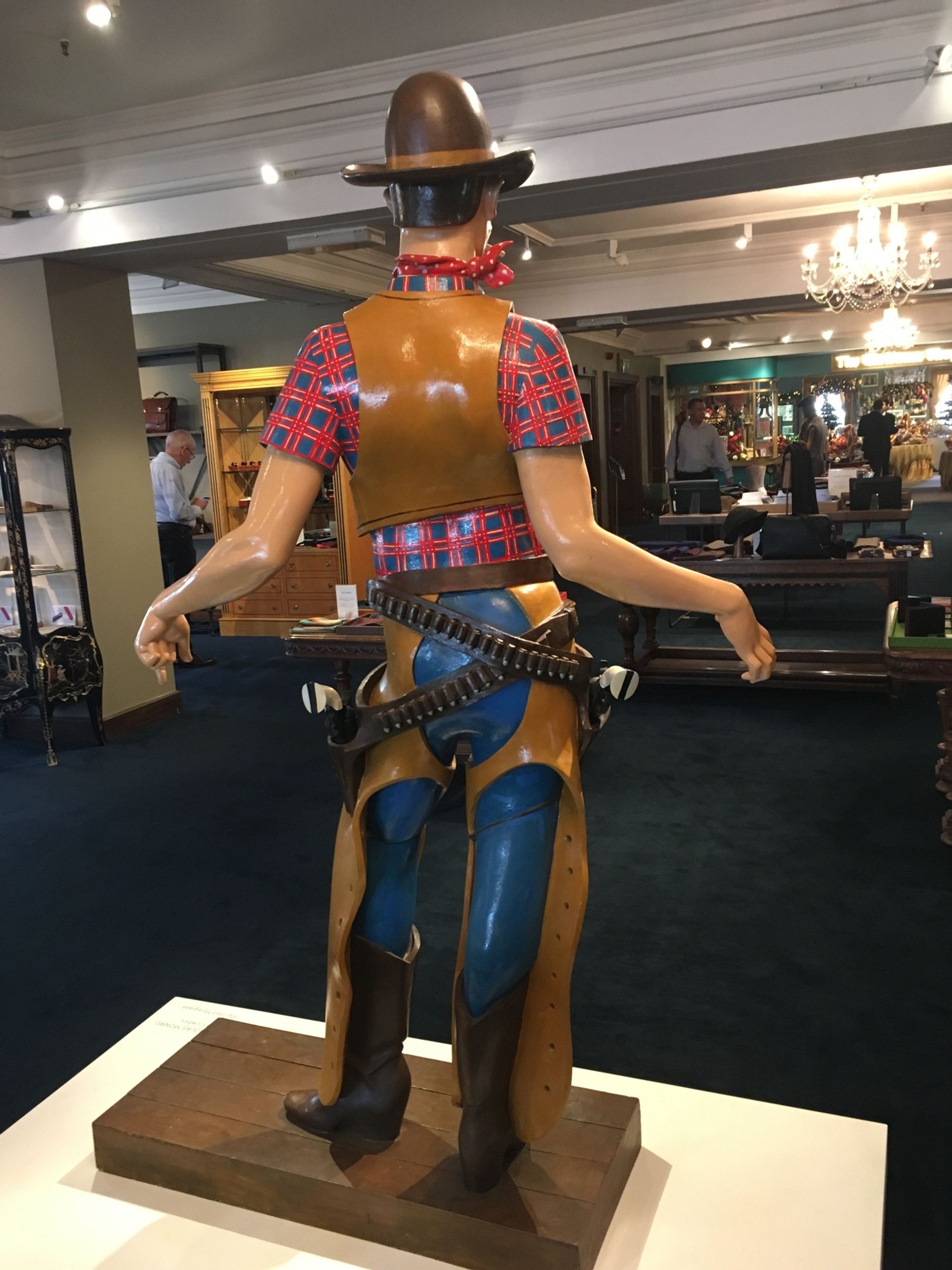 There’s an Edward Burra in the boardroom and a couple of Leon Kossoffs behind the ground floor cash desk. William Roberts’s large canvas of snooker players hangs in the basement wine bar and a pair of Howard Hodgkins grace the Duke Street staircase. In another stairwell, Paula Rego’s sinister School for Little Witches has a faceoff with a wall display of decidedly upmarket bath hats, while Nicholas Monro’s larger than life-size Dude Cowboy, from the 1970s, strikes a camp pose in menswear.