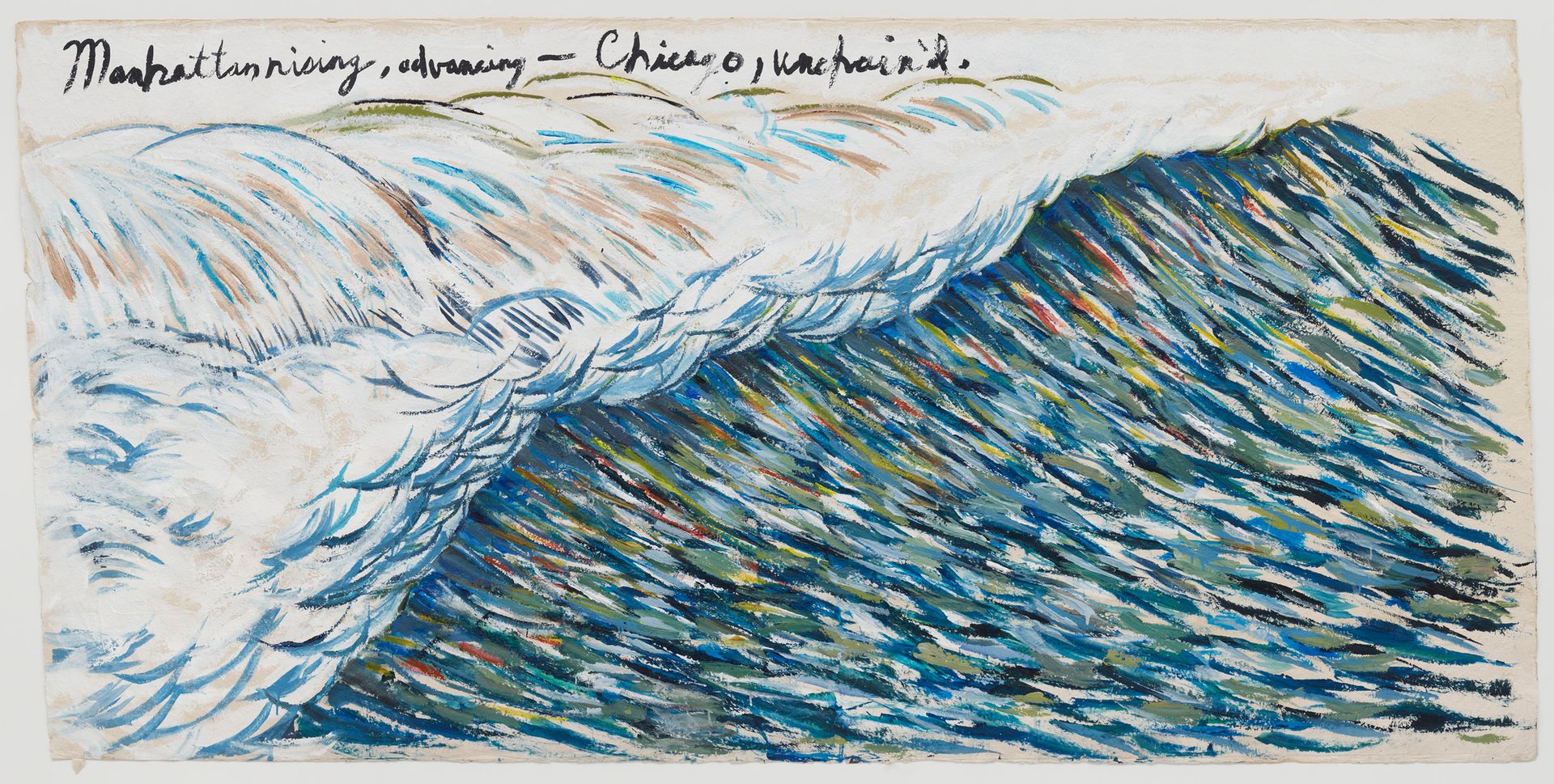 One of the galleries flanking this space, New York’s David Zwirner, is showing a large Raymond Pettibon wave painting from 2010 with text that could be a fitting motto for the fair: “Manhattan rising, advancing—Chicago unafraid”. Kristine Bell, a senior partner at the gallery, said the work came to them on the secondary market and the text was serendipitous.