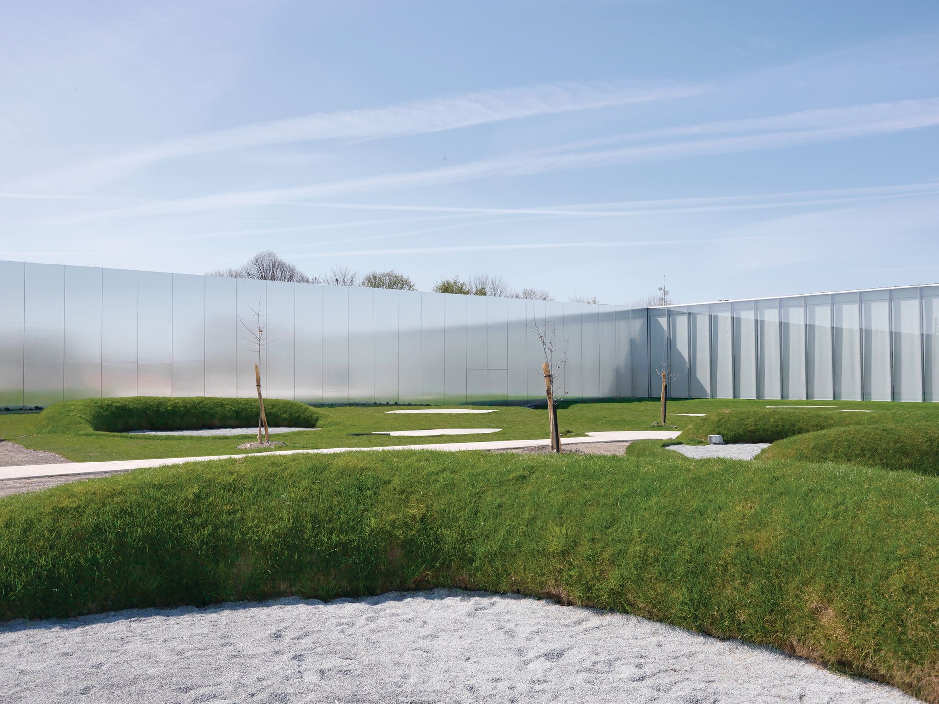 Rem Koolhaas followed with two stunning essays in the genre, Moscow’s Garage, a collage of a 1960s collectivist restaurant with a giant grid of elevated walls that reveal Gorky Park to all sides. Flat translucent polycarbonate walls play a leading role—industrial-scale glistening plastic planes rise up or fall down over the art pilgrims.