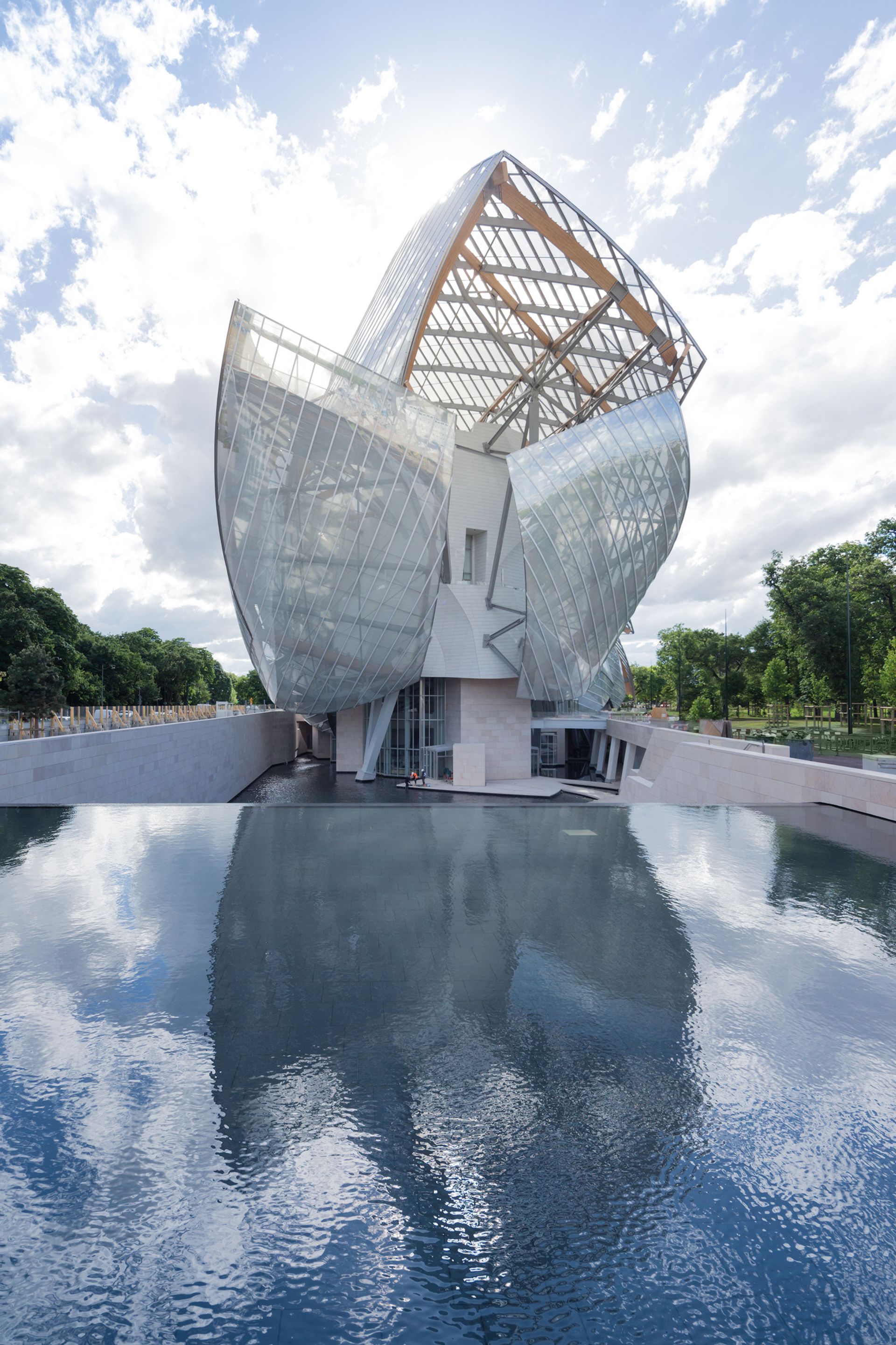 Perhaps the most vigorous set of metaphors struggling together is Frank Gehry’s Fondation Louis Vuitton in Paris, a direct descendant of his previous Bilbao Effect in important ways. It reuses the grammar of fluid vesica shapes, now in transparent glass not glistening titanium. These curved shapes recall the shells of the Sydney Opera House—and shells are good structural forms—as well as the pleats of sails and spinnakers, ever a Gehry image because of his love of sailing. Looked at in plan or from the air, the mixture of blocky functions and glassy shells becomes clear. The opposition can include minimal white and black cubes, utilitarian and cheap space, and contrast them with free-form sails. It also becomes apparent, from views through the woods, that Gehry’s eruptive body twists slightly towards its head, that these billowing shards of glass, with their tectonic pleats, move like a slouching beast away from the roadside traffic. The body may not be as common a metaphor with contemporary icons as the crystal and geological strata, but faces, arms, buttocks and breasts have been suggested since the time of Le Corbusier’s Ronchamp Chapel, the first great icon of Post-Modernism, back in 1955.