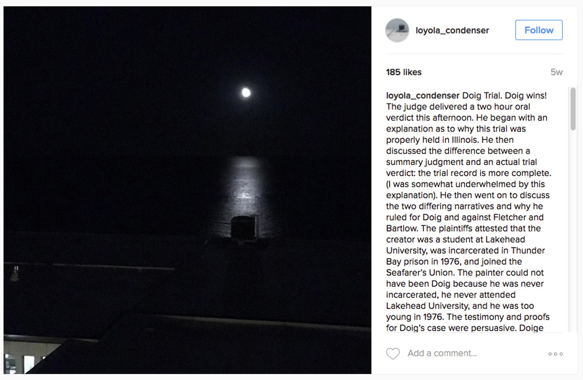 The notes, which Barense published as annotations to her Instagram posts, were comprehensive and opinionated. She stood by Doig (with whom she became friendly) and was elated when the verdict came out in his favour. “Doig Trial,” she wrote in a post from 23 August, along with a picture of the condenser obscured by night. “Doig wins!”