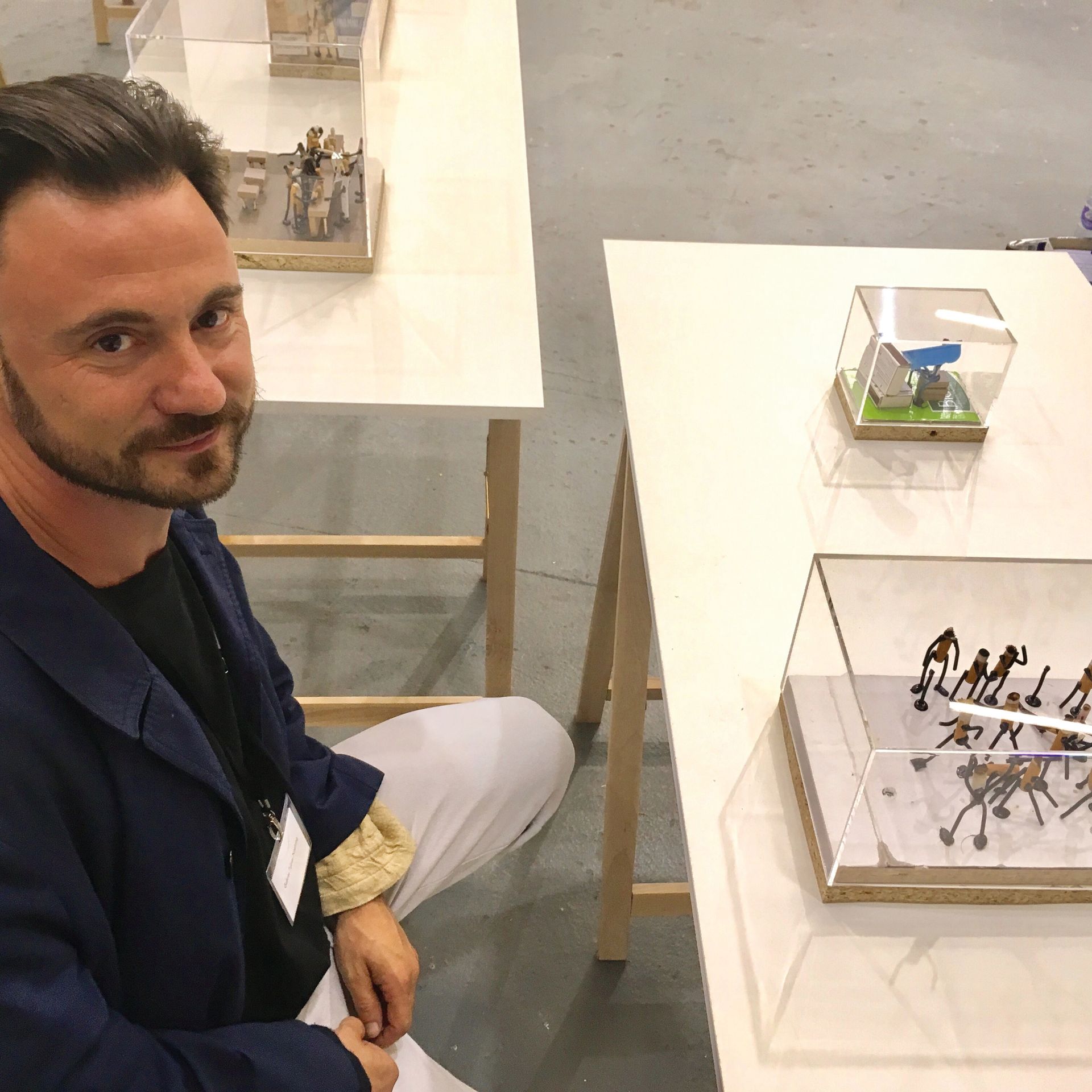 Attracting attention on Galerie Tobias Naehring’s stand at Sunday Art Fair is a series of eight mini-scenarios invoking key scenes from recent German history, acted out by crowds of highly animated cigarette butts and with the help of other nicotine-related detritus. These ashy protagonists pull down a Berlin Wall made from cigarette packets, engage in round-table reunification discussions around an upturned ashtray, queue up for cash handouts, get drunk, riot and end up as a rather disconsolate couple sitting on a matchstick park bench. “We want to depict the most significant events using the cheapest materials,” declares their co-creator Wilhelm Klotzek (above), who, with fellow artist David Polzin, works under the collective name of Klozin. He confesses that, as heavy smokers, both artists are never short of materials—although too much demand for their work might prove detrimental to their health.