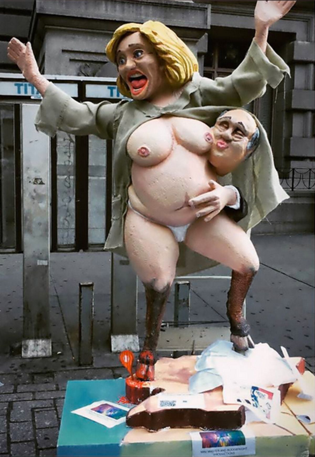 A statue depicting a bare-breasted Hillary Clinton wearing only an open blouse and white panties—with satyr hooves instead of feet, and a Wall Street banker poised to suckle from her breast—appeared at the Bowling Green Subway station near Wall Street in New York on 18 October. It was removed within two hours. According to the New York Post, an employee at the nearby National Museum of the American Indian took offence to the statue, broke it in front of a young man who claimed to be the artist and contacted the police, who demanded its removal. “I hope they put you in cuffs!” the putative artist was quoted saying to the iconoclast, who identified herself as “Nancy”.