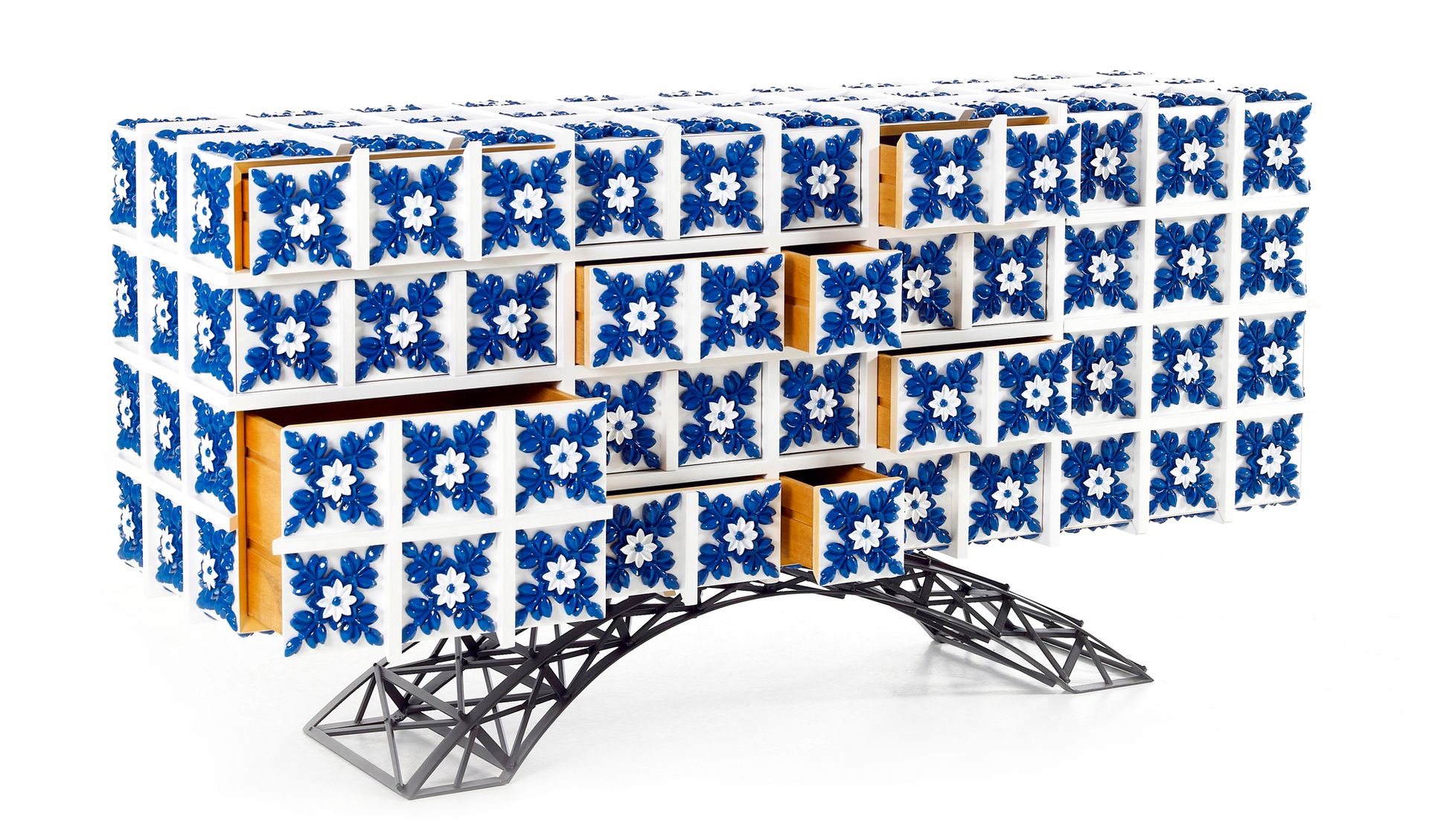 Focusing on design from the Middle East, North Africa and South Asia, the Abwab exhibition (named after the Arabic word for ‘doors’) shows works in a national pavilion format. This year, the countries represented are Algeria, Bahrain, India, Iraq, Palestine and the United Arab Emirates. The pavilions, located within the walkways of d3, have been designed by the Dubai-based studio A Hypothetical Office and are made from woven plastic based on the structure of a greenhouse.