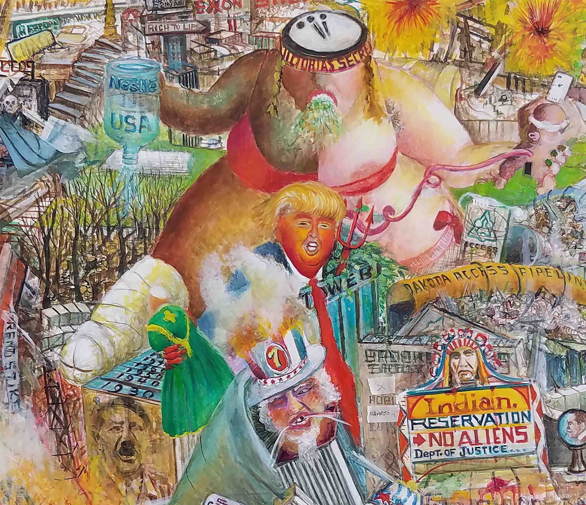 In a palette of fire, the three-paneled painting Fin del Mundo (End of the World) by Robert Cenedella is a panorama of cataclysm—war, environmental rot and cultural decay—with an orange-haired Donald Trump holding a pitchfork at its center. The Liberty Bell can be seen in the foreground, bearing the names of black men shot by the police in the US. Amid the fires are the Twin Towers, Hitler, and a grotesque headless woman vomiting over Trump’s head—the alternative, Cenedella says, to the Miss Universe standard of female beauty. The painting is due to go on view in the gallery window of Central Park Fine Arts at West 57th Street on 2 November, a week before the US election.