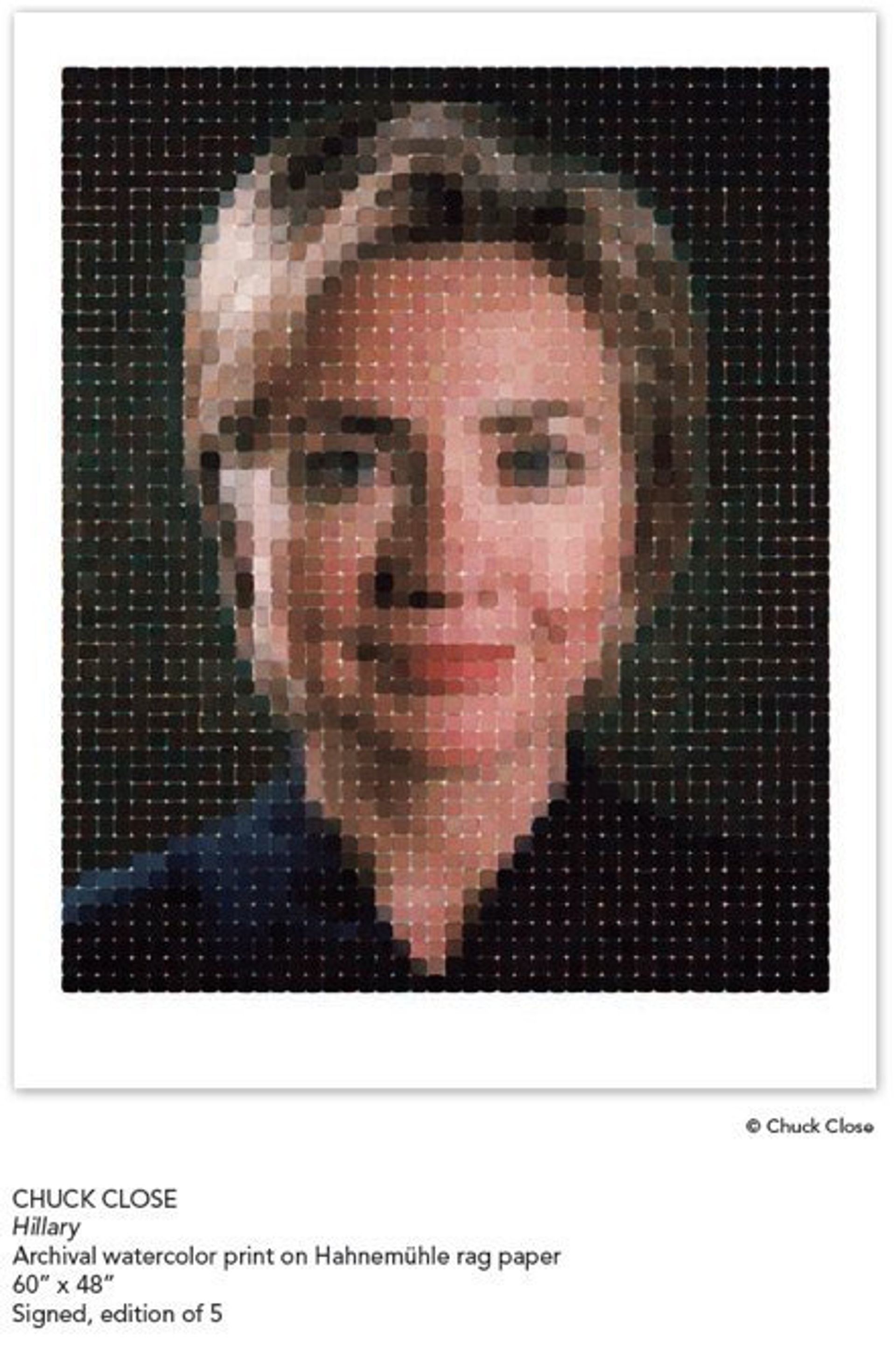 Koons was not available for comment, but recently told Monopol magazine that he had supported Clinton for 20 years. She awarded him with the Medal of Arts in 2013, when she was Secretary of State. Close, too, is a long-term supporter of the Democratic Party and the Clintons, in particular. “I have been involved in political campaigns starting with Bill Clinton and then Hillary for Senate, and I did a big thing for Barack Obama, and in between I raised a lot of money for Al Gore: every time there’s a Democratic presidential race, I’ve done art auctions or other things,” he says. In the case of Obama's re-election campaign in 2012, he produced ten tapestry portraits of the US president that were sold for $100,000 each, as well as an edition of related prints. “Artists are the last of the soft-touches; if you want contributions for a charity or anything like that, ask an artist.”