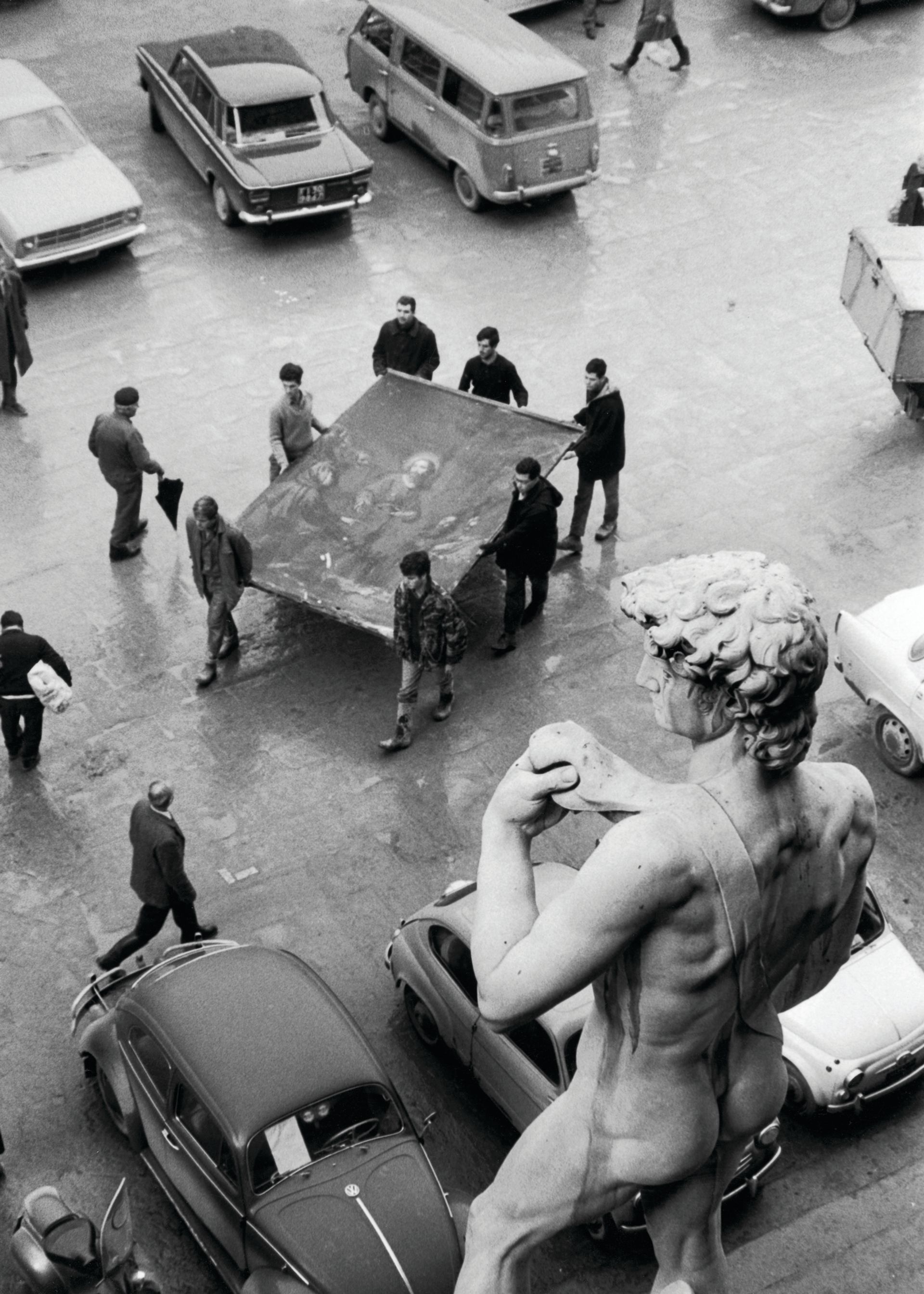 It is because of the FAIC initiative that we know that Ugo Procacci, the superintendent of Florence’s museums, cried when he saw the state of Cimabue’s 13th-century Crucifix (widely considered the Medieval artist’s greatest work)—half of its paint had been stripped away by the waters, which crested at Christ’s halo. It is also how we know that one panel painting still bears the imprint of the shoe of a museum guard because he did not realise what he was stepping on when he went to retrieve his raincoat, and that a representative from DuPont drove all the way from Paris with large container of Elvacite (a synthetic resin) for the conservators to use. The oral histories also revealed that a technique devised to remove oil stains from the city’s many sculptures came from a discussion on the best methods for getting spaghetti bolognese stains off clothes.