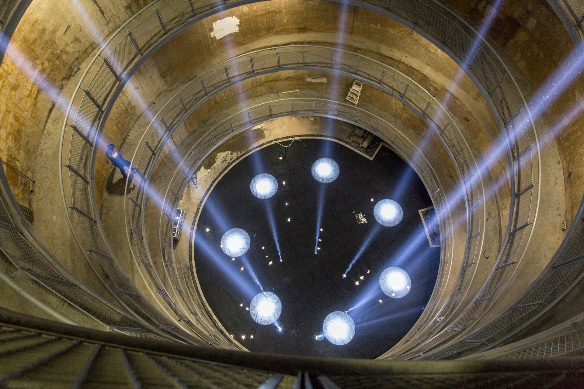 Moonlight-evoking spotlights reflect on water at the base of PSA’s smokestack in Vishal Dar’s Maruts (Storm Deities).