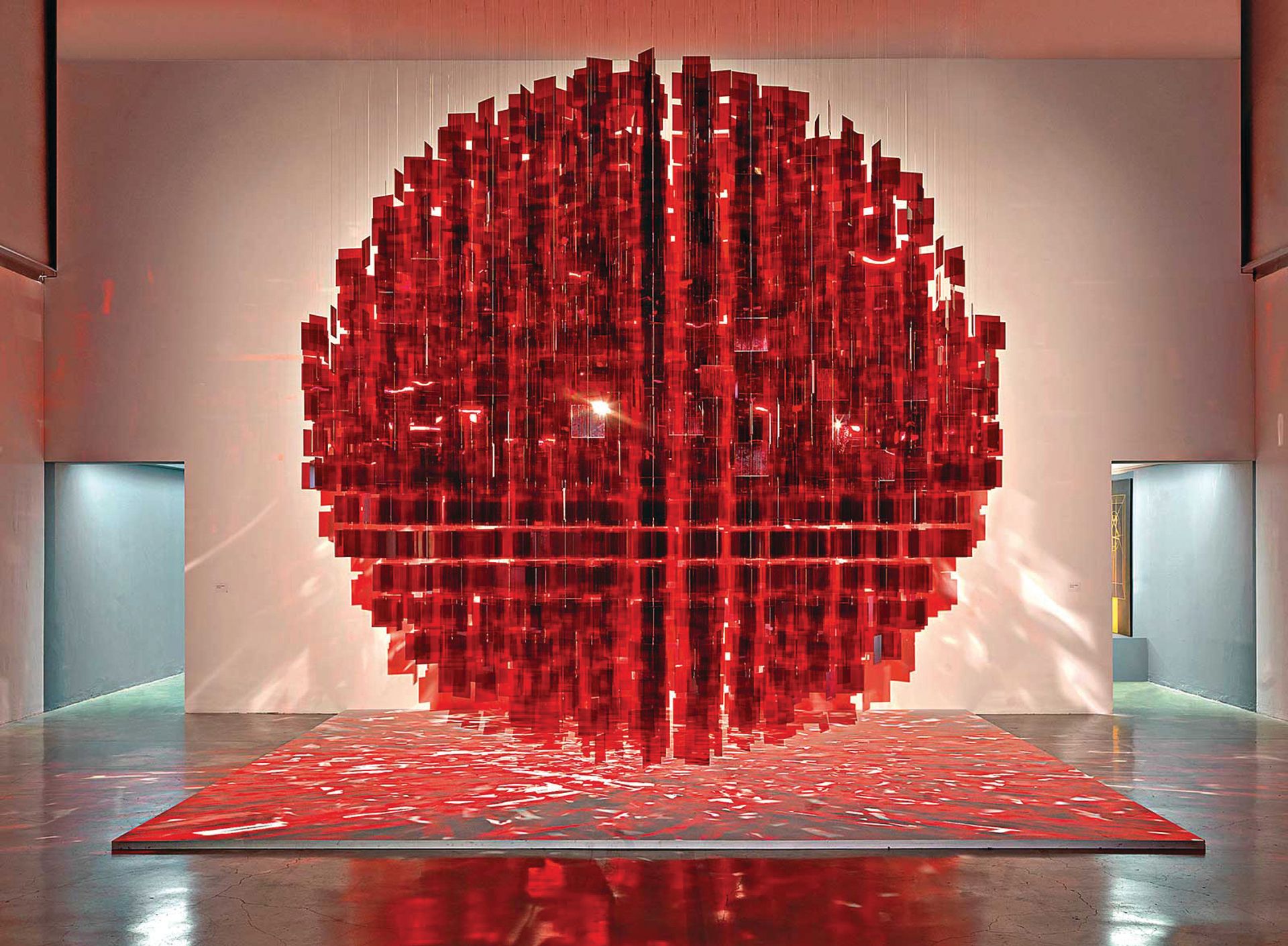 The show ends on a bold note with this large suspended work, which is more than three metres in diameter. Although it appears to be spherical, it is actually made of small, suspended Plexiglas squares.