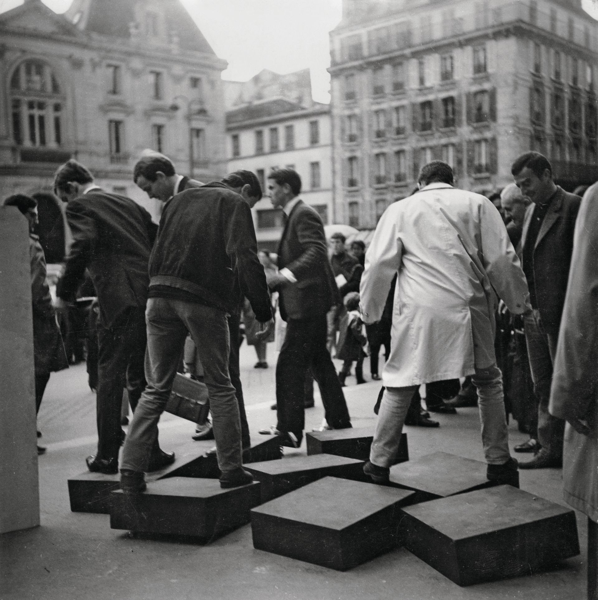 During the 1960s, Le Parc was a member of the Grav collective, which staged public interventions such as this one, called Une Journée dans la Rue (Day in the Street). On 19 April 1966, the collective invited passers-by to walk on blocks of wood placed on the street in Paris.