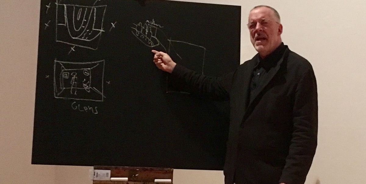 First, there were chalked-up diagrams on a blackboard including one of a pre-birth artist on a conveyor belt, where “I chose my parents”, along with his images of heaven, hell and fate. Then a series of 100 projected-images took us from the head of a corpse in a morgue—juxtaposed with that of a 1930s doll—to a diagram of the five worlds of meaning and materials, with Mullican using your correspondent’s keys as an extra prop.