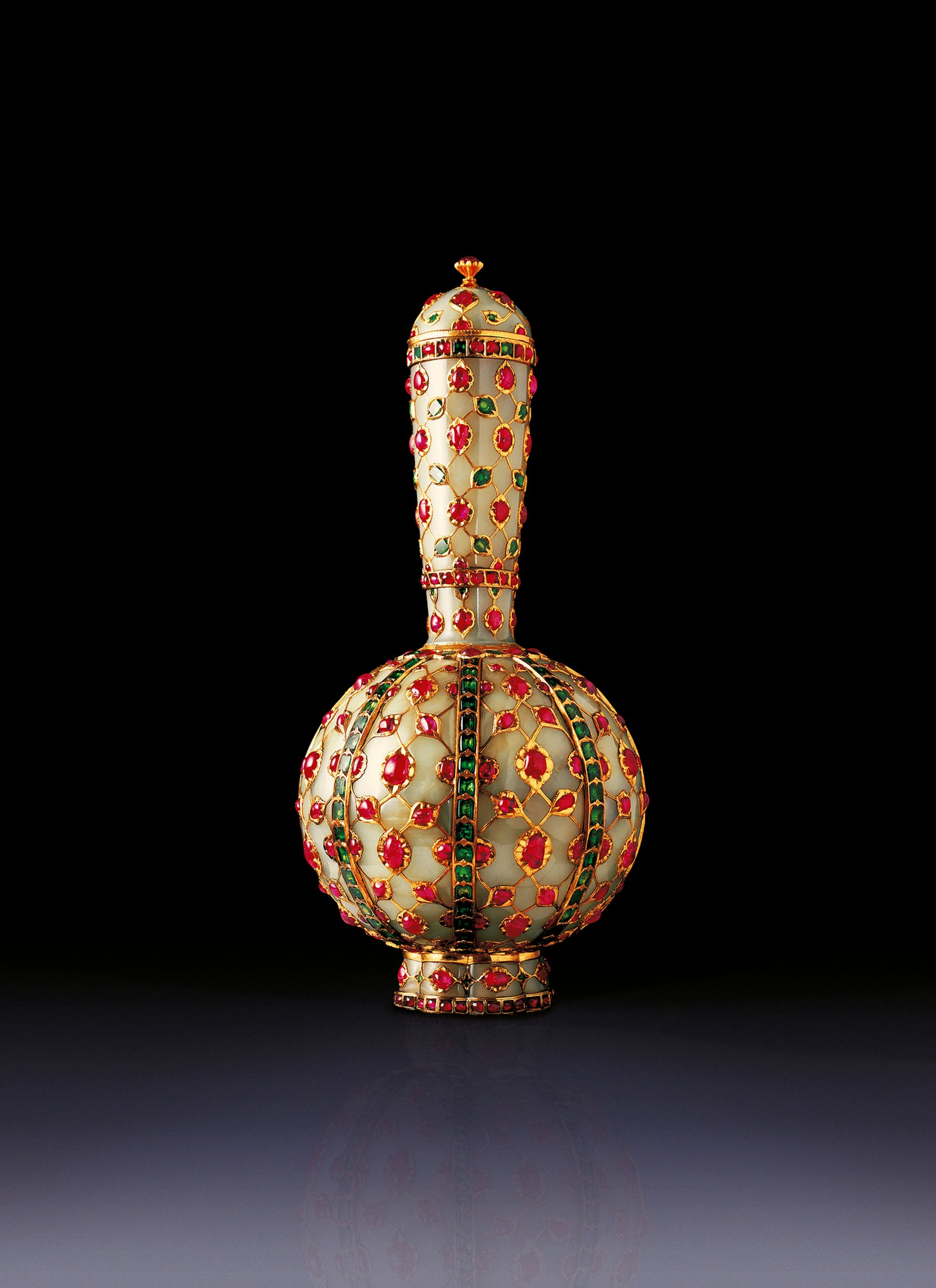 After the Qataris withdrew the export licence applications in 2005, they were required to keep the objects in the UK. The flask and huqqa were lent to the V&A’s 2009 Maharaja exhibition and are still on loan to the museum. Although the flask travelled with the exhibition when it toured to Munich, Toronto, San Francisco, Chicago and Richmond (Virginia), the huqqa is very fragile (its enamel is flaking off) and has remained at the museum.