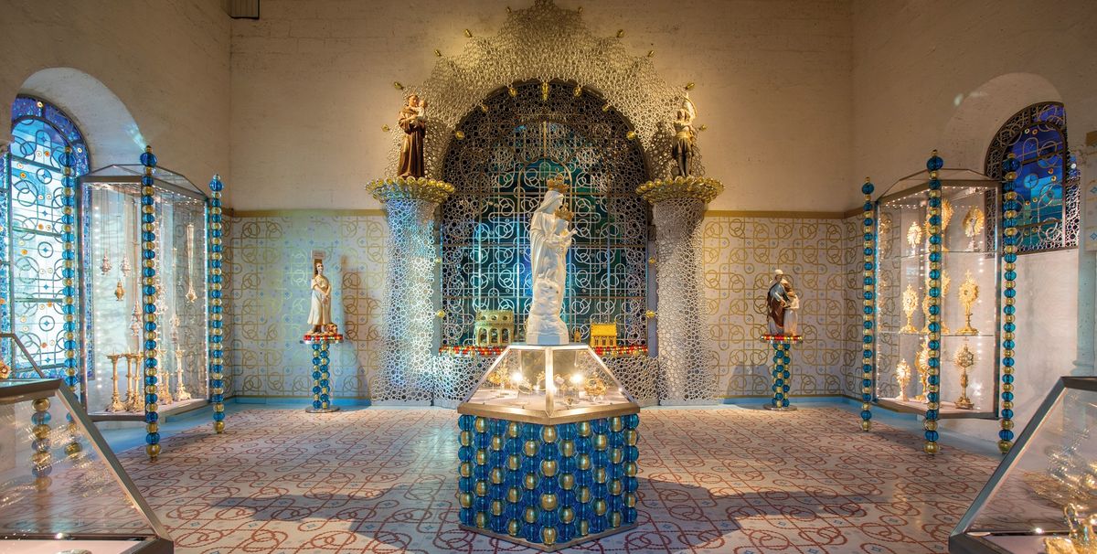 The Cathedral of Saint-Pierre in Angoulême, south-west France—a sumptuous 12th- century Romanesque building that was reworked by Paul Abadie, the architect behind the Sacré Coeur basilica in Paris—has had a 21st-century makeover: its treasury has been given the gesamtkunstwerk treatment by the French artist Jean-Michel Othoniel. His intricate three-room work Trésor (2016), which houses around 200 objects, is full of his signature round glass bead and tracery work. The artist was inspired by historic sources such as Romanesque art’s geometric designs and the Arts and Crafts movement, and says his work fits in with the building’s history. “Abadie already worked with the original Romanesque design. I’m following him, in a continuum,” he says.