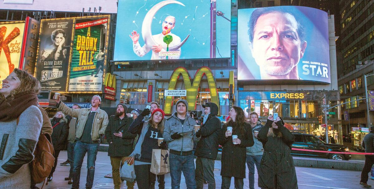 Imagine wandering through Times Square, drunk or on some other kind of substance, when all of a sudden, right at midnight, the looming video advertisements suddenly transmogrify into a masculine figure in make-up singing Blue Moon to a flaming head of lettuce. This is in fact exactly what occurred throughout Feburary, when Times Square Arts brought a video work by Alex Da Corte to the screens of Broadway, kicking off the project on 1 February with a sing-along. (The lyrics to Blue Moon, for those unversed in the 1934 popular hit, ran along the bottom of the screens.) “I like the democratic nature of this,” said the Whitney’s curator Chrissie Iles. “Anyone, tourists or anyone who’s hanging around Times Square, can join. Art always makes public spaces—it lifts them up somehow, counteracts any commercial stuff.” Participants on that chilly winter night were given delicious hot cider, gratis. The singing itself was of middling quality. And most people did indeed seem to be drunk or on some other kind of substance.