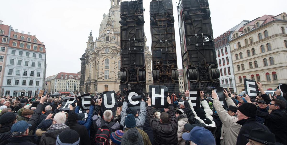 Around 150 protesters gathered in Dresden’s Neumarkt to disrupt the opening with chants of “traitors” and “get lost,” says Christiane Mennicke-Schwarz, the artistic director of the Dresden Kunsthaus, which is overseeing the work. Dresden's mayor Dirk Hilbert’s speech was greeted with cries of “Hilbert must go.” Police officers were at the scene, she says.
