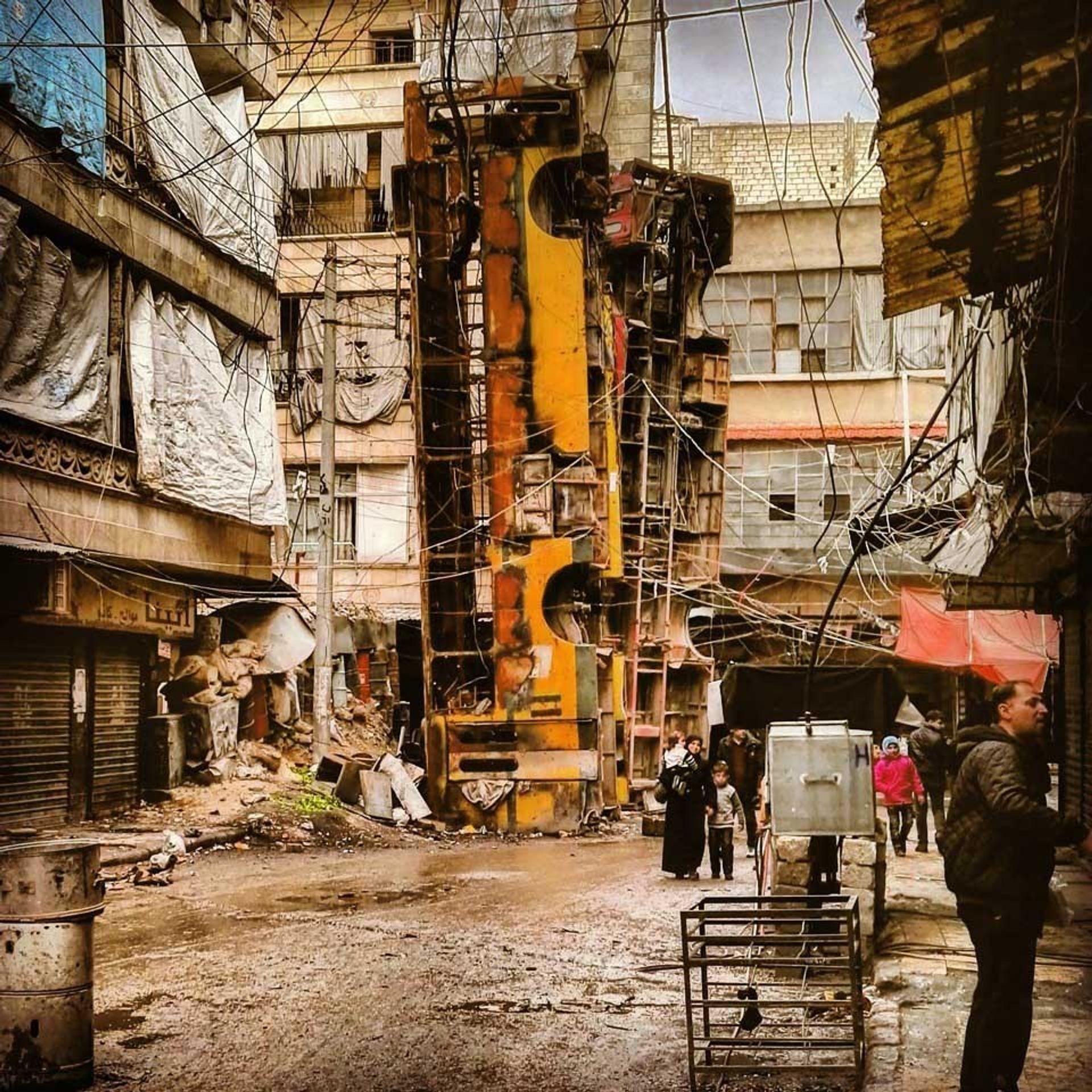 “Monument” refers to a photograph taken in Aleppo in 2015, showing buses turned on their heads and fastened together with wire to barricade a street and protect the residents from the fighting. It is designed to reflect the suffering and loss of war but also hopes for peace and reconstruction, symbolised by the Frauenkirche, which was destroyed in the Second World War and rebuilt after German reunification.