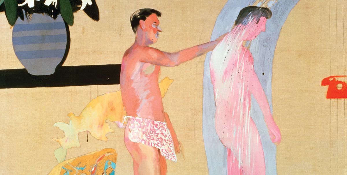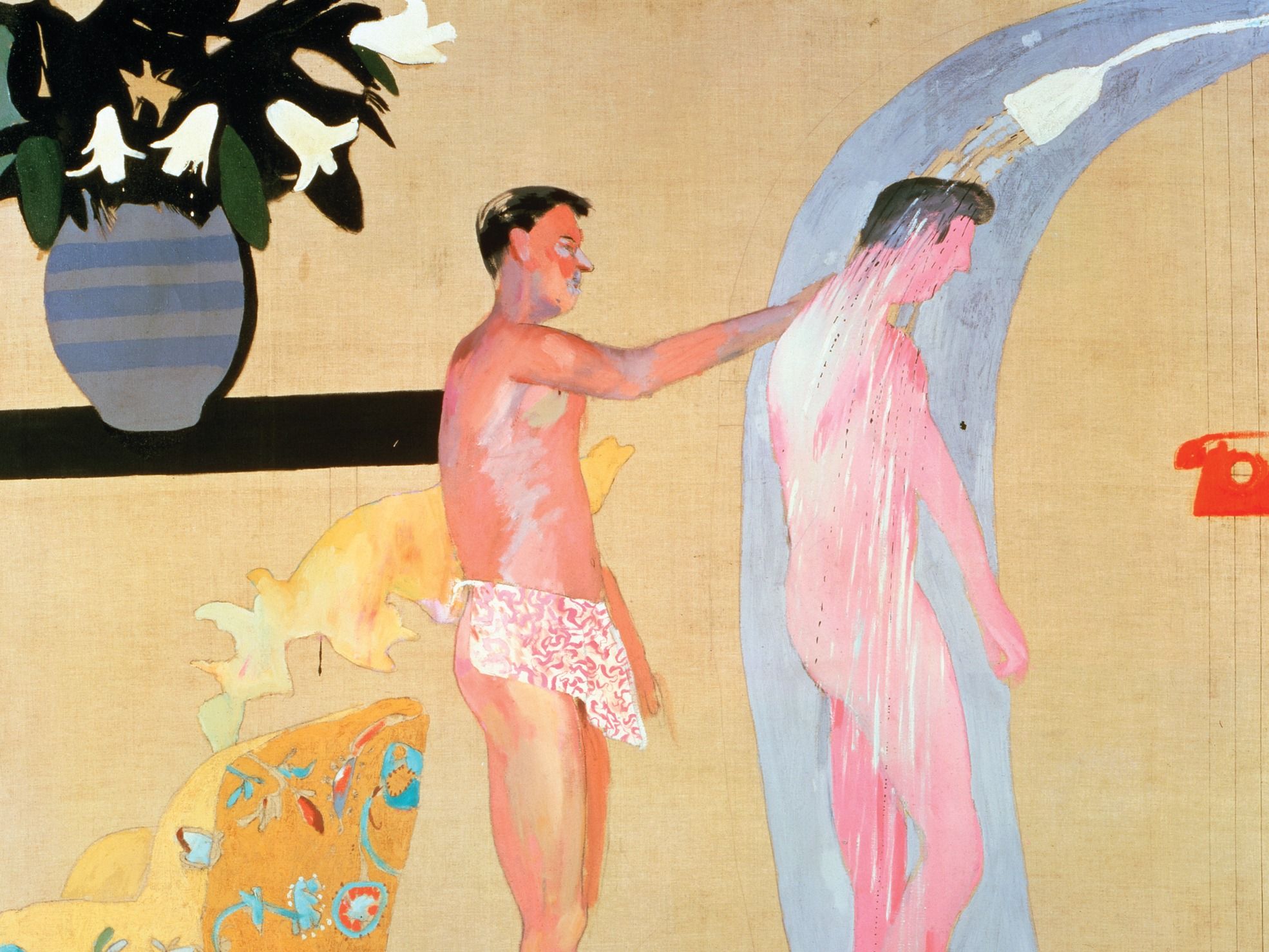 The exuberant room of works painted whilst studying at the Royal College of Art are daring in both form and content, as Hockney samples and combines incongruous styles—scratchy Francis Bacon, scribbled Alan Davie, Jean Dubuffet’s art brut and scrawled graffiti—whilst flamboyantly proclaiming his own homosexuality. There is cruising, coupling and dancing the cha-cha. In Cleaning Teeth, Early Evening (10PM) W11 (1962), a cartoonish pair of hideous, sack-like figures—one chained to the bed—have mutual oral sex, their penises replaced by squirting tubes of Colgate toothpaste and a tube of Vaseline peeping from beneath the bed. Particularly brave, given that homosexual acts were not decriminalized in England until 1967.