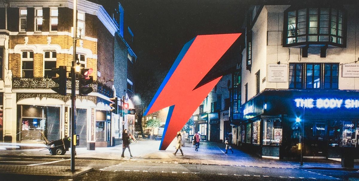 London seems set to get a new landmark with the announcement yesterday (21 February) of plans to raise a permanent memorial to David Bowie in his Brixton birthplace. It will take the form of a 9m-high steel rendition of the famous blue and red makeup flash from the cover of Bowie’s 1973 Aladdin Sane album.
