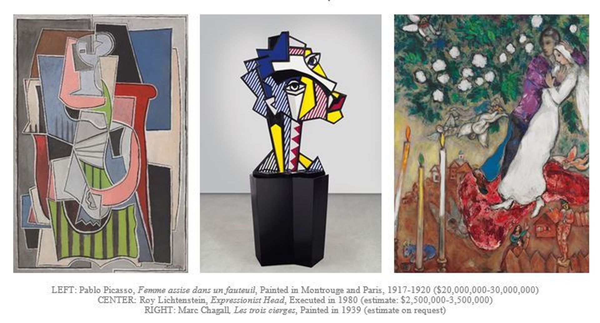 The works, which carry a total estimate of $37m to $59m, were praised by Christie’s chairman Laura Paulson as “remarkable” and will tour London, Hong Kong, San Francisco and Los Angeles before they are auctioned in New York. The 15 May Impressionist and Modern art evening sale will feature Picasso's early painting Femme assise dans un fauteuil (1917-20, est $20m-$30m), owned by the artist's family until 1984 and Miller since 2000, as well as a major work by Chagall, Les Trois Cierges (1939, estimate on request).