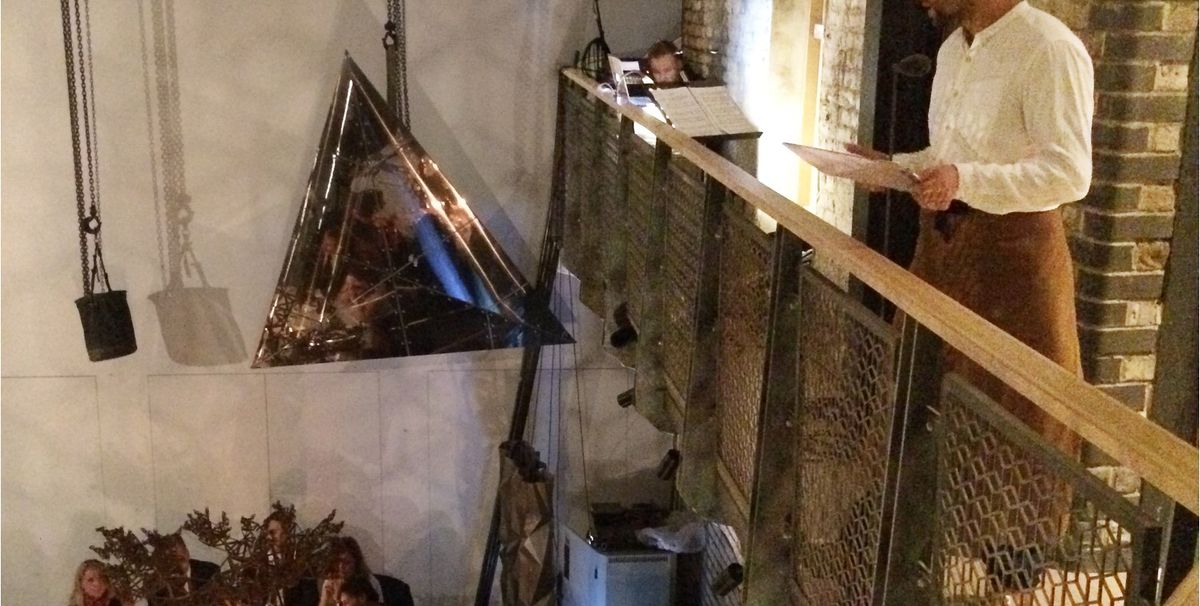 The 84-strong crowd sat surrounded by Shawcross’s sculptures and were also treated to some live action by one of them, when the artist-composer Mira Calix joined forces with a Shawcross robot-sculpture to perform her piece called “if then while for”. Part of Shawcross’s The ADA Project, the composition had been written and choreographed especially for this robotic encounter, and also incorporated a lament by the soprano Charmian Bedford. Then, as if this wasn't enough, as a grand finale Shawcross produced a giant tetrahedral cake whose geometric shape features in much of his work.