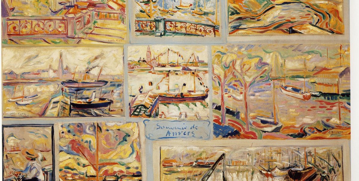 A text alongside the illustration of Souvenir d’Anvers says “Friesz and Braque sat side by side, painting the same views and each challenging the other to paint with the most radical colours and the least commitment to literal representation possible.” The painting shows nine small harbour scenes described in the Sotheby’s catalogue as views of Antwerp.
