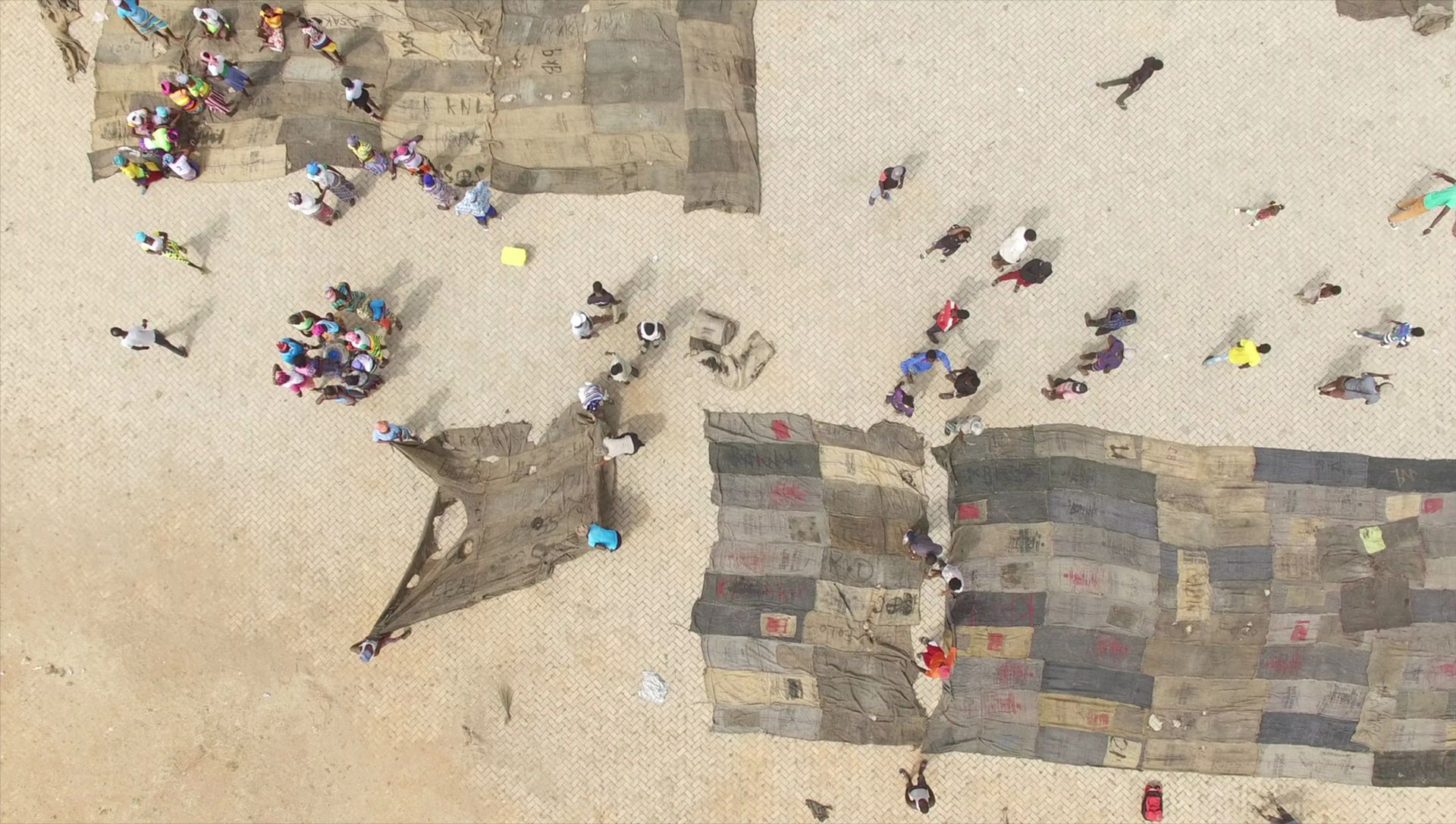 Made in Bangladesh and India, the sacks are imported to Ghana and used to move cocoa beans, one of the country’s leading exports, to the ships which will transport them to international markets. Because cocoa beans are a fragile luxury export, the sacks will move the product first and only once. They are then used multiple times to take crops such as rice, millet and maize around the country for domestic consumption. Finally, they are used to shift coal. Mahama and his collaborators acquire the sacks at the end of their working life, sewing them together to create massive tapestries which the artist has draped over buildings in Ghana such as theatres, museums, luxury apartments, and social housing projects, among others, and abroad (for the 2015 Venice Biennale he covered two external walls of the Arsenale with 300-metre-long hangings).
