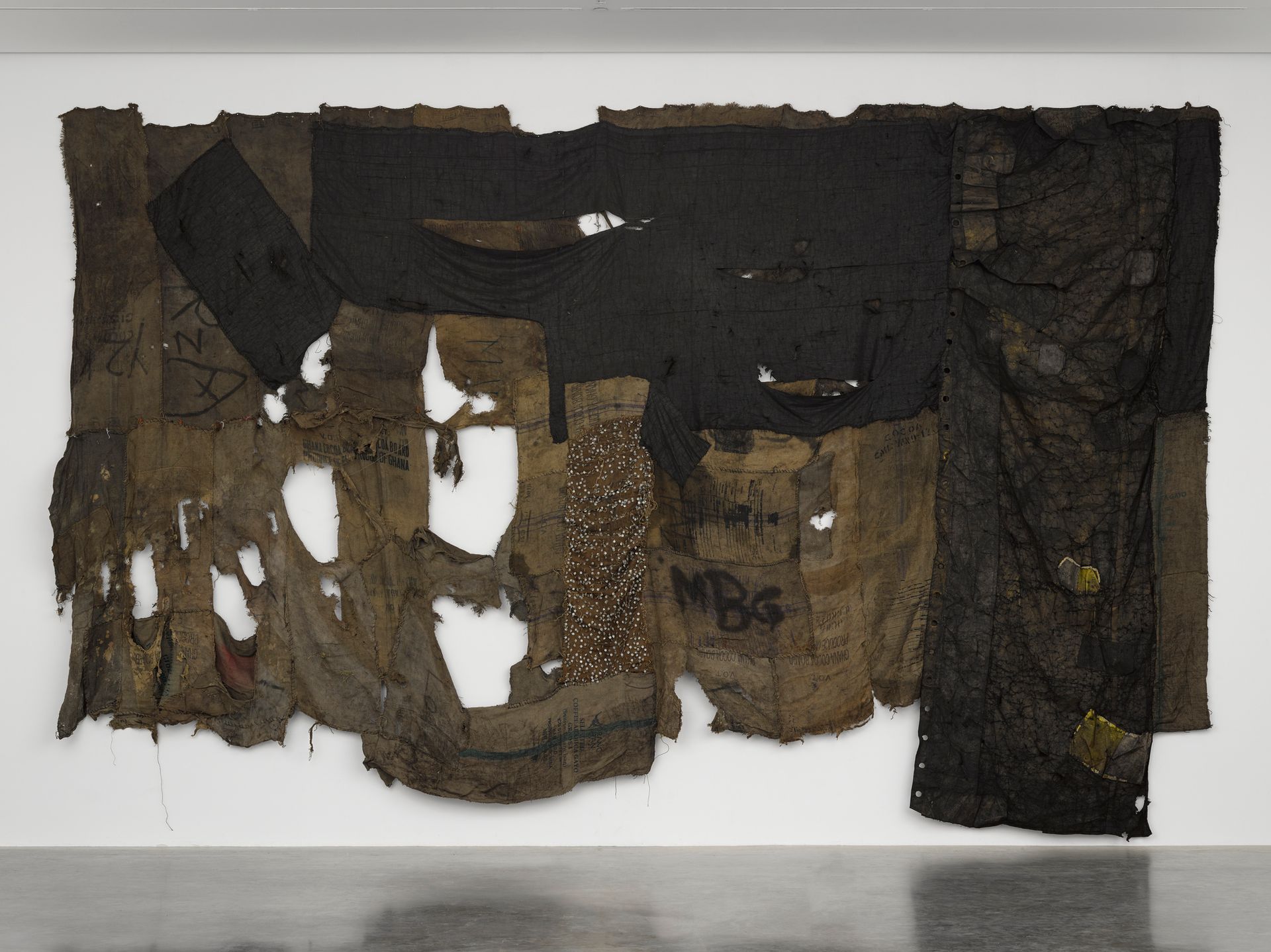 The memory of objects Mahama’s debut exhibition at White Cube, and his first solo show in the UK, opens to the public tonight (28 February). It includes five wall hangings made from the jute sacks which are used to transport goods in Ghana. Their history illustrates the complex trade networks of the global economy and post-independence Ghana.