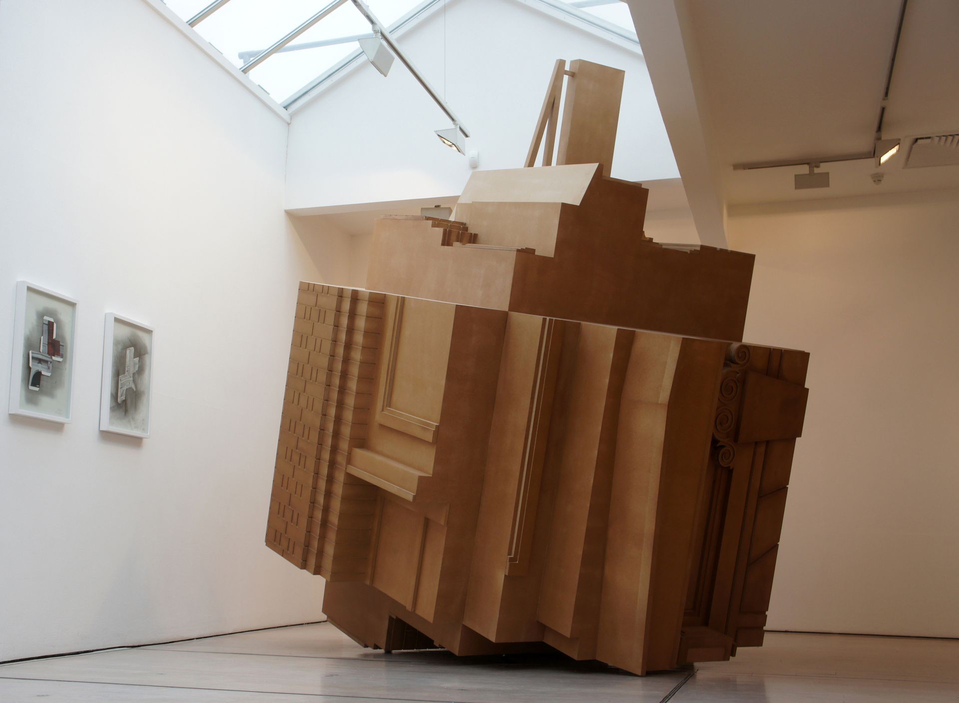 Which is why Wilson’s current exhibition at Annely Juda is so welcome. It is not easy to show work devoted to reconfiguring space, but the Juda gallery has risen to the challenge with four new sculptural pieces that almost entirely fill the gallery. Two of these are made in direct response to the gallery’s internal and external architecture. One is a wooden solidification of the space between the hallway and staircase leading up to the gallery’s main entrance, which sprouts architectural details and sits on the floor, tilted at an angle. The other, called Block of Dering (2017), takes the Dering Street façade of the gallery building and reconfigures it into a near-cube.