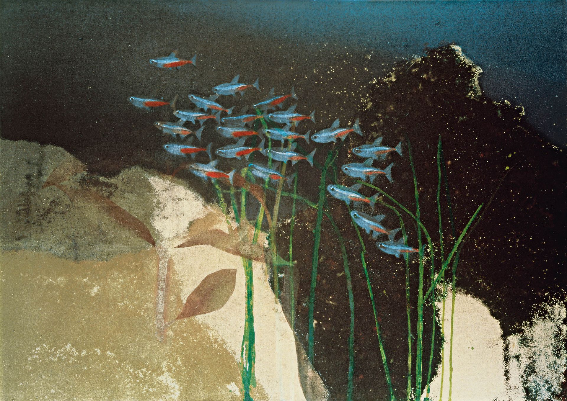 However, this laboriousness was always worn with the utmost lightness. In Andrews’s limpid and luminous late works, both his oil and his acrylic paint (and sometimes a mixture of the two) became ever thinner and increasingly devoid of expressive gesture. He even used spray guns to stain his unprimed canvas with mists of evanescent colour. But while his methods might have been as self-effacing as his personality, this only made the presence of the finished work become more haunting and powerful. It did not matter whether Michael Andrews was painting parties, panoramas or shoals of fish, he firmly believed that “all is subject to atmosphere”.