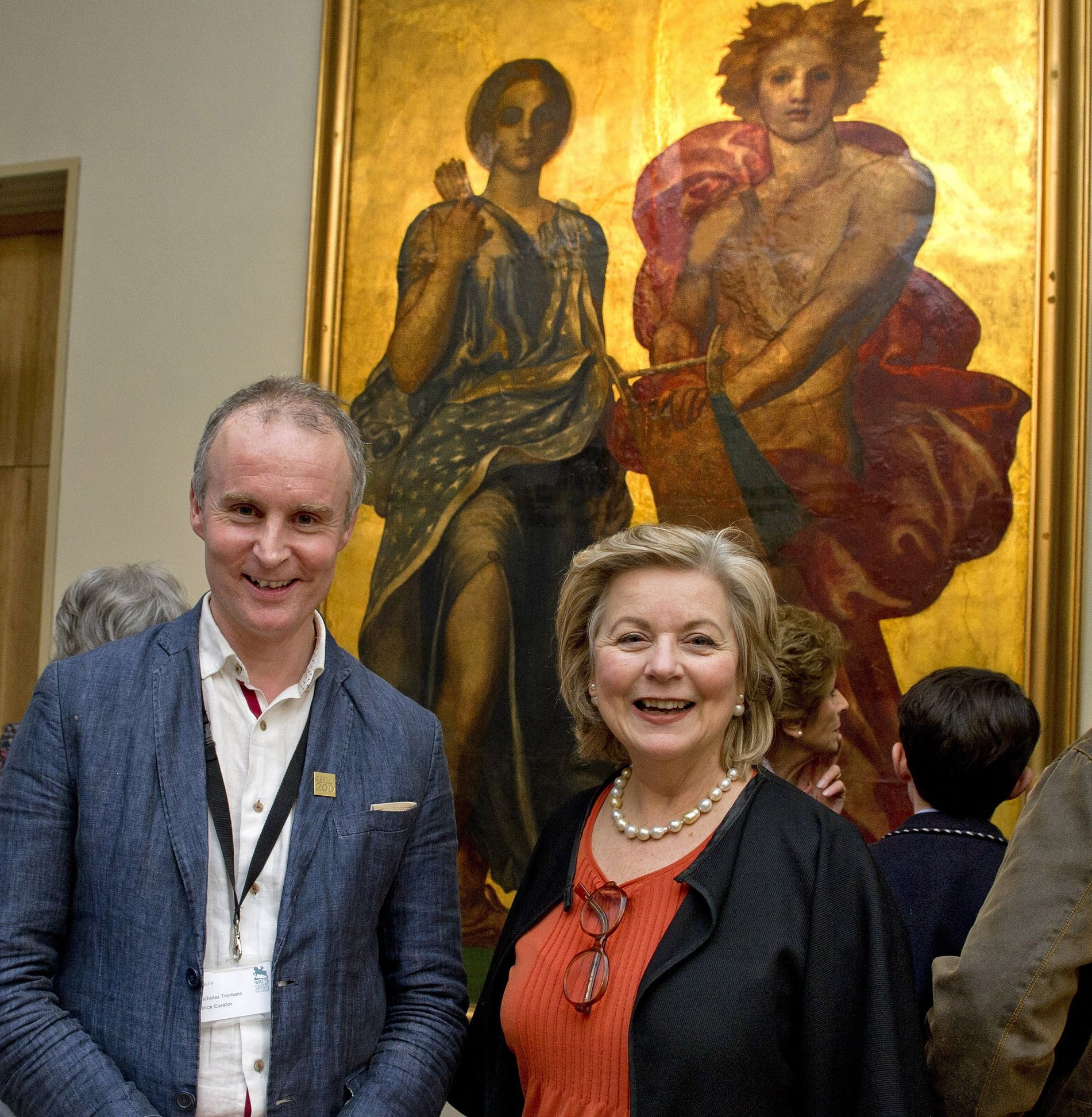 It seems that Hitler’s favourite architect Albert Speer found the art of Victorian artist George Frederick Watts to his taste. The exhibition at the Watts Gallery near Guildford, south of London, about Watt’s mural paintings (until 5 November) includes this Diana and Apollo executed to decorate the dining room of Virginia, Countess Somers’s London house, 7 Carlton House Terrace. This later became the German embassy and photographs taken just before the Second World War show the room remodeled in Speer’s pared away classical style, but with Watts’s picture cycle of the Elements carefully framed. Perdita Hunt, the outgoing director of the Watts Gallery, who has done an astonishing resurrection job on this artists’ village, has cleverly roped in the support of the descendants of the many Victorians painted by Watts, which is how our chairman, Anna Somers Cocks, comes to be photographed here, with curator Nicholas Tromans, after having made the opening speech. In it, she admitted that Watts’s mural paintings were not his greatest legacy (she rates him first, for his sculptures, second for his drawings and paintings), but that they need to be studied for a complete understanding of an artist who could reach great heights and who was so venerated in his time that the Metropolitan Museum’s first ever exhibition dedicated to a living artist was given over to him.