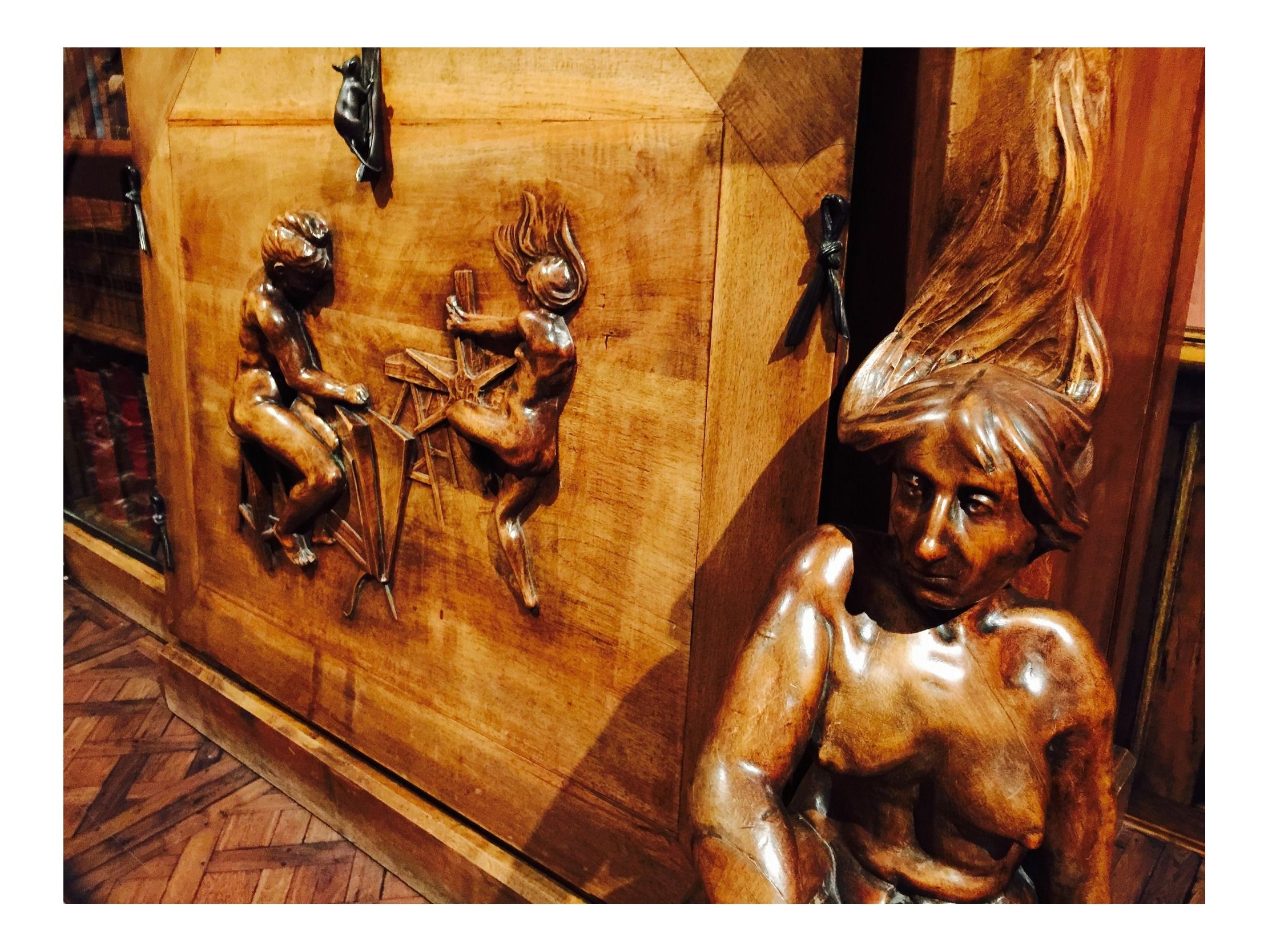 The 1890 walnut bookcase was commissioned by the wealthy engineer and amateur artist Henry Montandon. According to Fleur de Carvalho, the curator of the Amsterdam show, Montandon probably kept prized erotica in the lower print portfolio cabinet. The front of the cabinet is carved with two nudes in relief, one energetically astride a printing press and the other leafing through a print collection. An ironwork mouse serves as the cabinet’s handle.