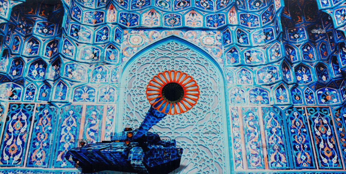 The show features two new works. The enormous wall-sized “stamp painting” Camouflage (2017), which Gharem builds using thousands of small rubber stamps, depicts an army tank taking aim at the viewer against the background of a colourful Iranian mosque. The work, to be installed in the lobby of the museum’s main building, hints at how theocracies can hide their own religious intolerance behind the guise of piety. A new dome sculpture Hemisphere (2017) is half modelled on the distinctive green dome of the Mosque of the Prophet in Medina, and half on a late Islamic-style warrior’s helmet, bringing together a symbol of peace and war in one form. One of Gharem’s earlier dome sculptures, Message/Messenger (2010), sold at Christie’s in 2011 for $842,500, making it the most expensive work at auction by a living Arab artist at that time.