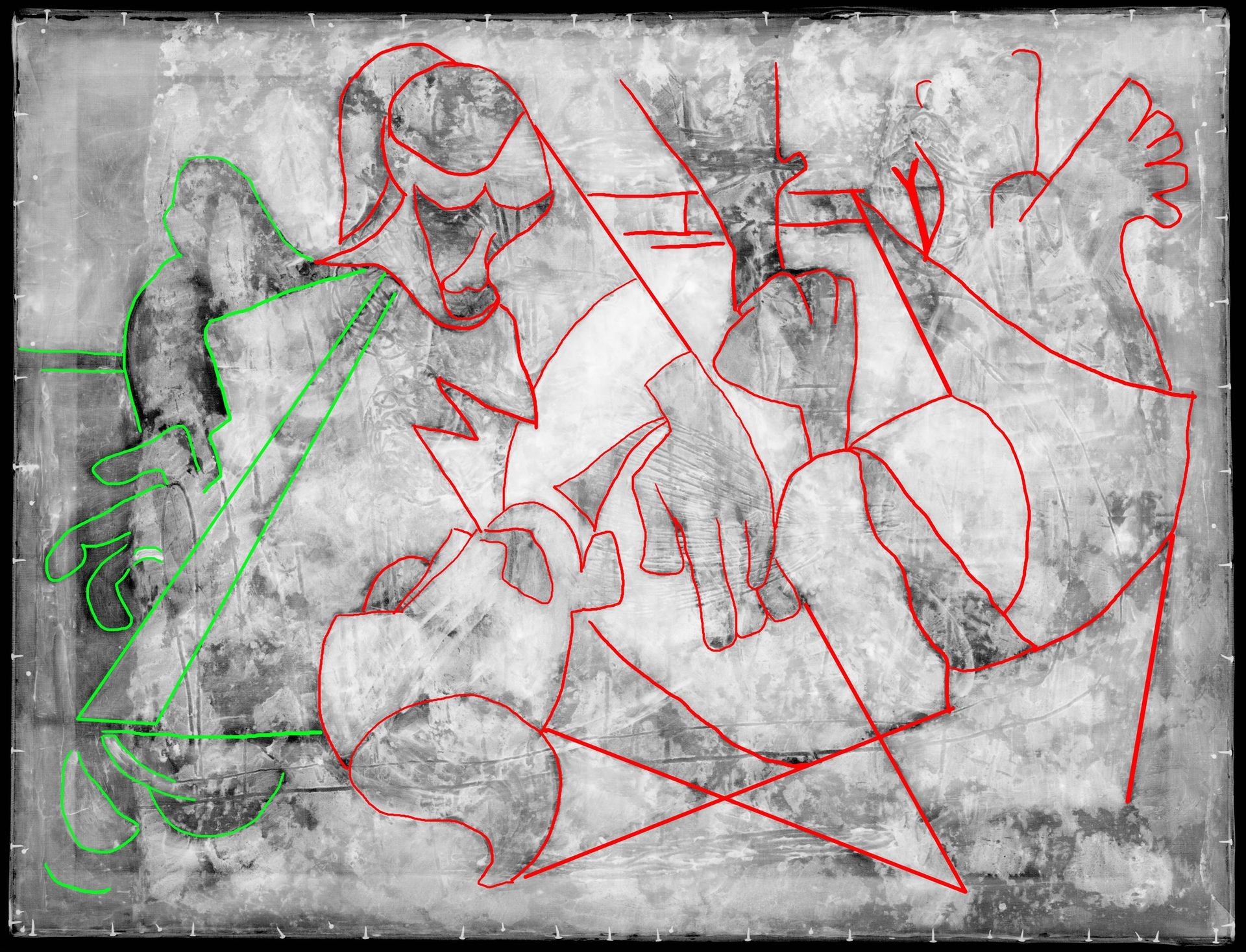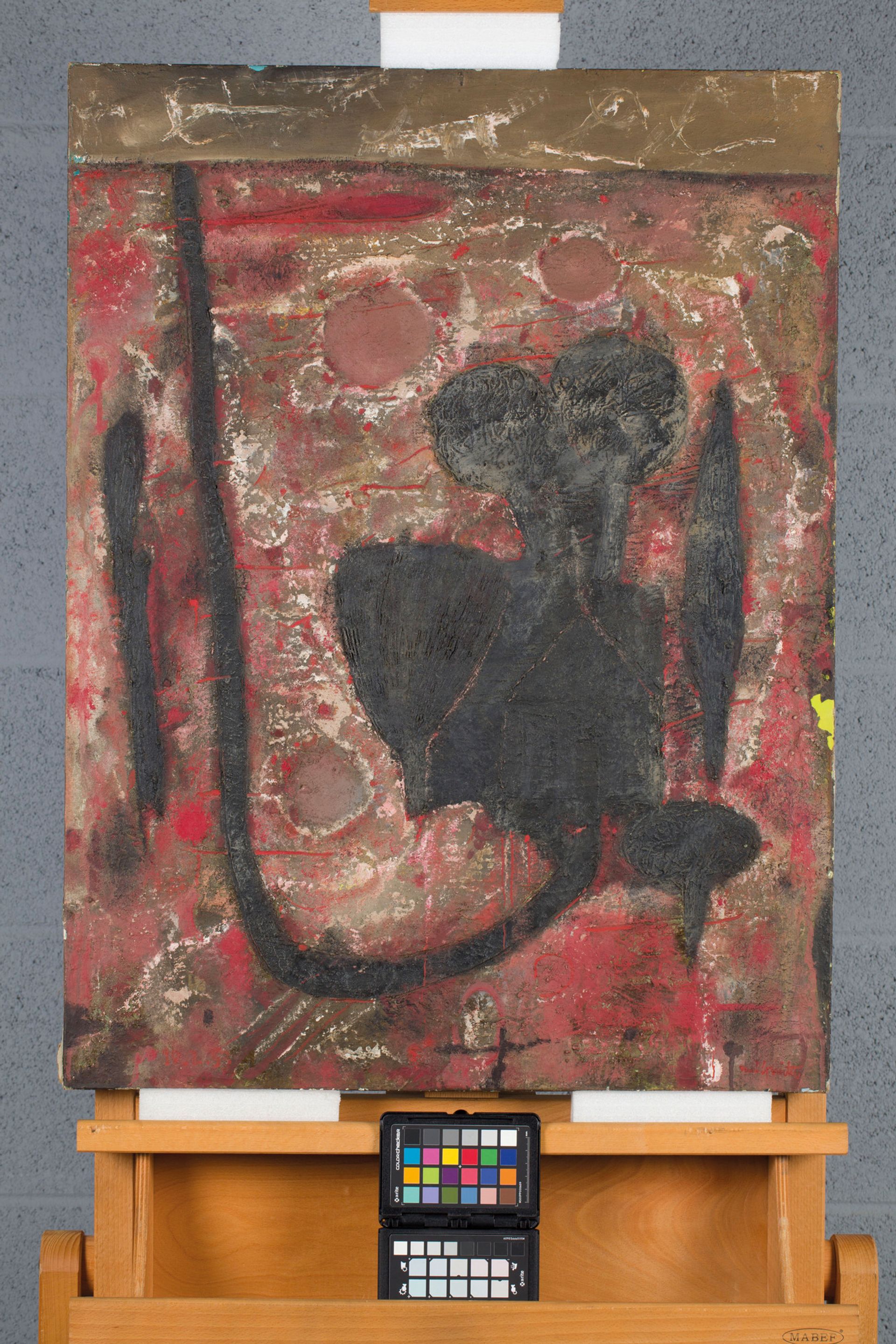 X-ray radiography revealed the presence of another composition that De Kerchove d’Ousselghem knew of from a photograph and had been looking for. The hidden composition, a landscape rather than a portrait shape like Paysage, dates to around 1941 when Guiette was interested in Cubism. By the time he created Paysage more than decade later he had moved on to Art Brut. He was known to reuse canvases when his painting style evolved or when supplies were limited, such as during the Second World War.
